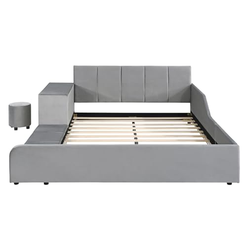 Velvet Upholstered Grounded Bed Platform Bed, Wooden Queen Size Mother & Child Bed Frame with Bedside Desk and Little Round Stool, Kids Adults Bedroom Furniture Floor Bed Platform Bed (Pink Bed)