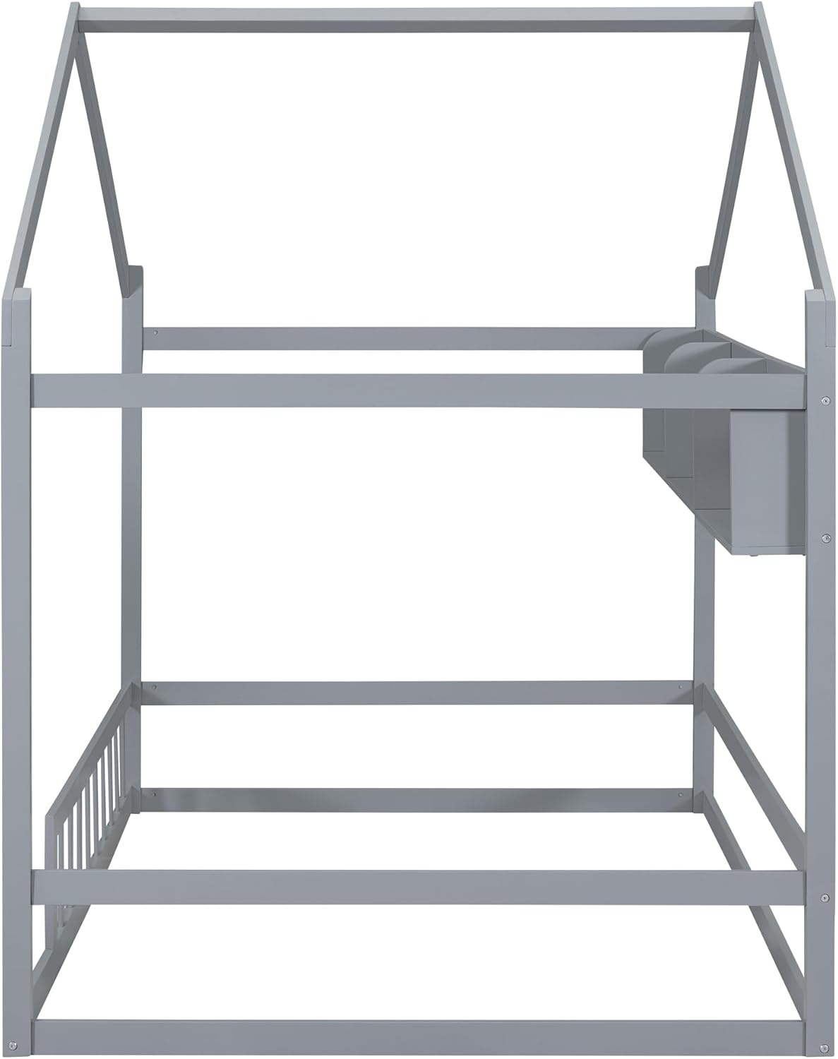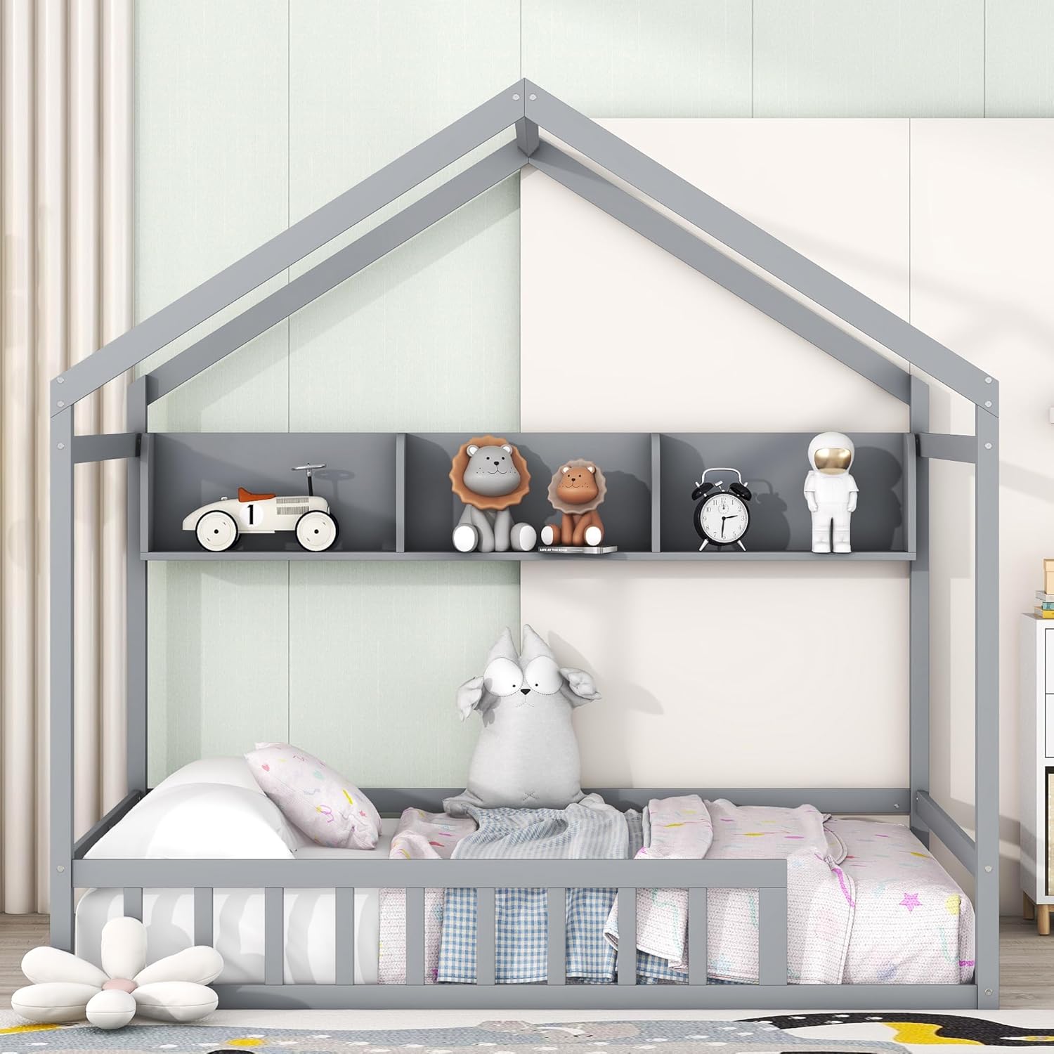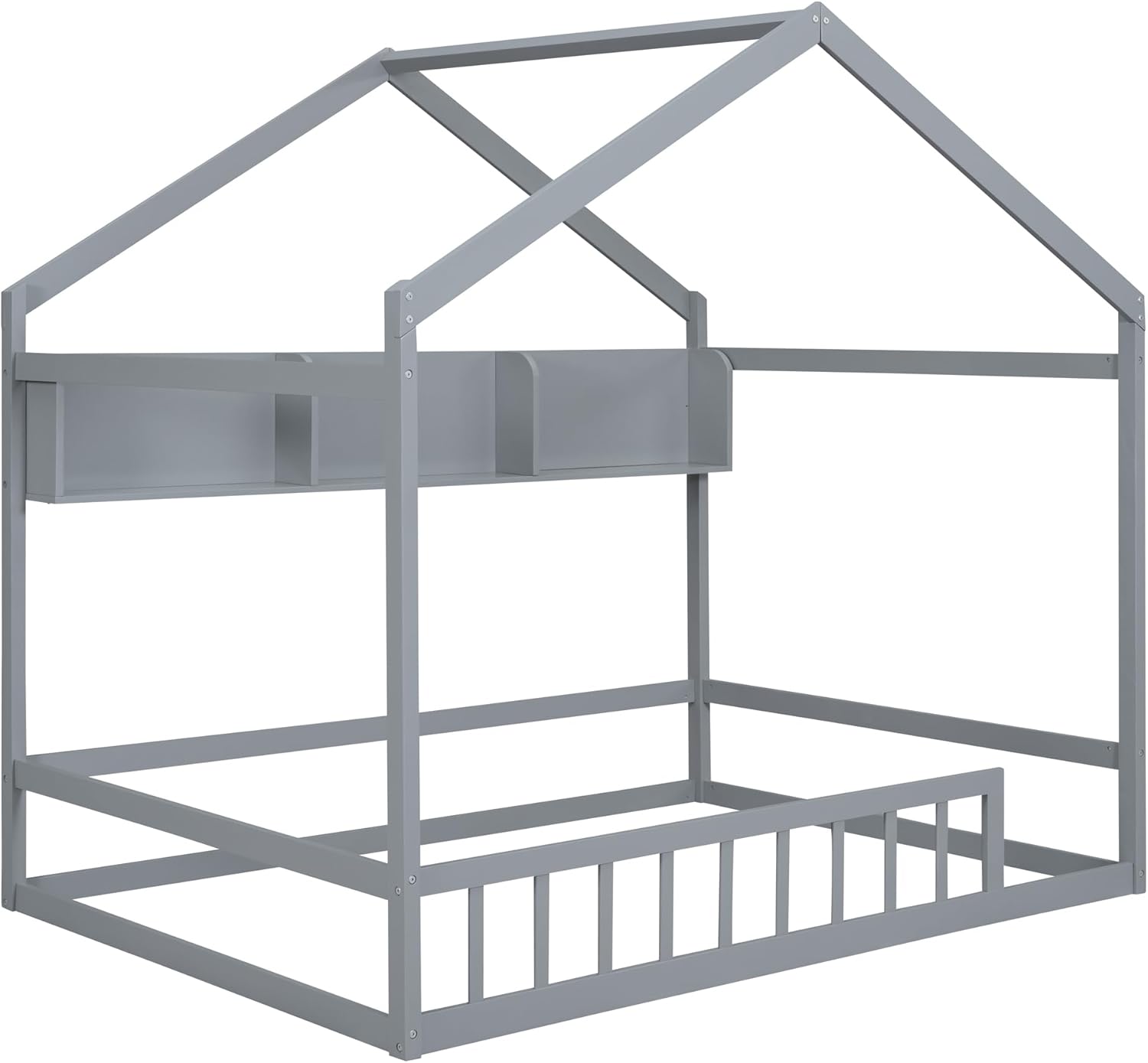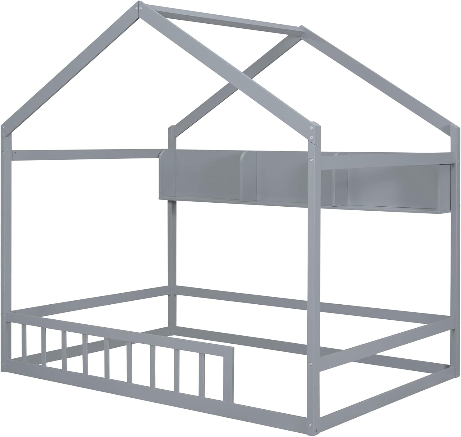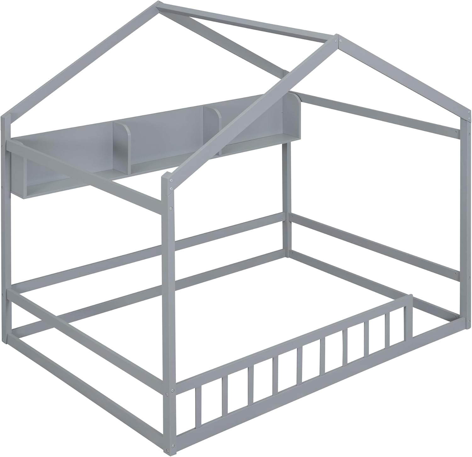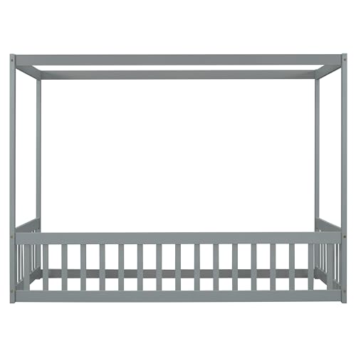 Harper & Bright Designs Full Size House Bed with Storage Shelf, Montessori Floor Bed with Fence and Roof, Wooden Full Bed Frame for Kids, Gray