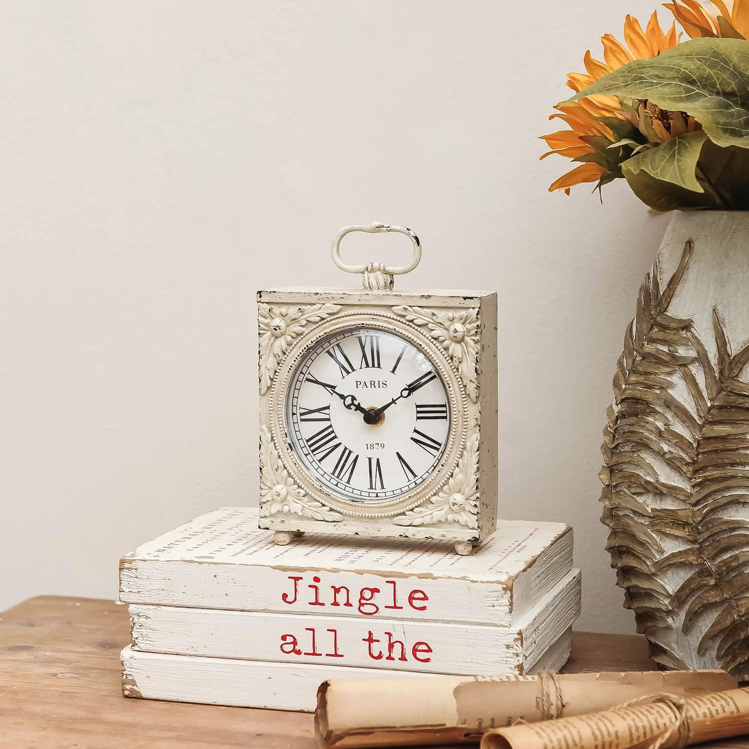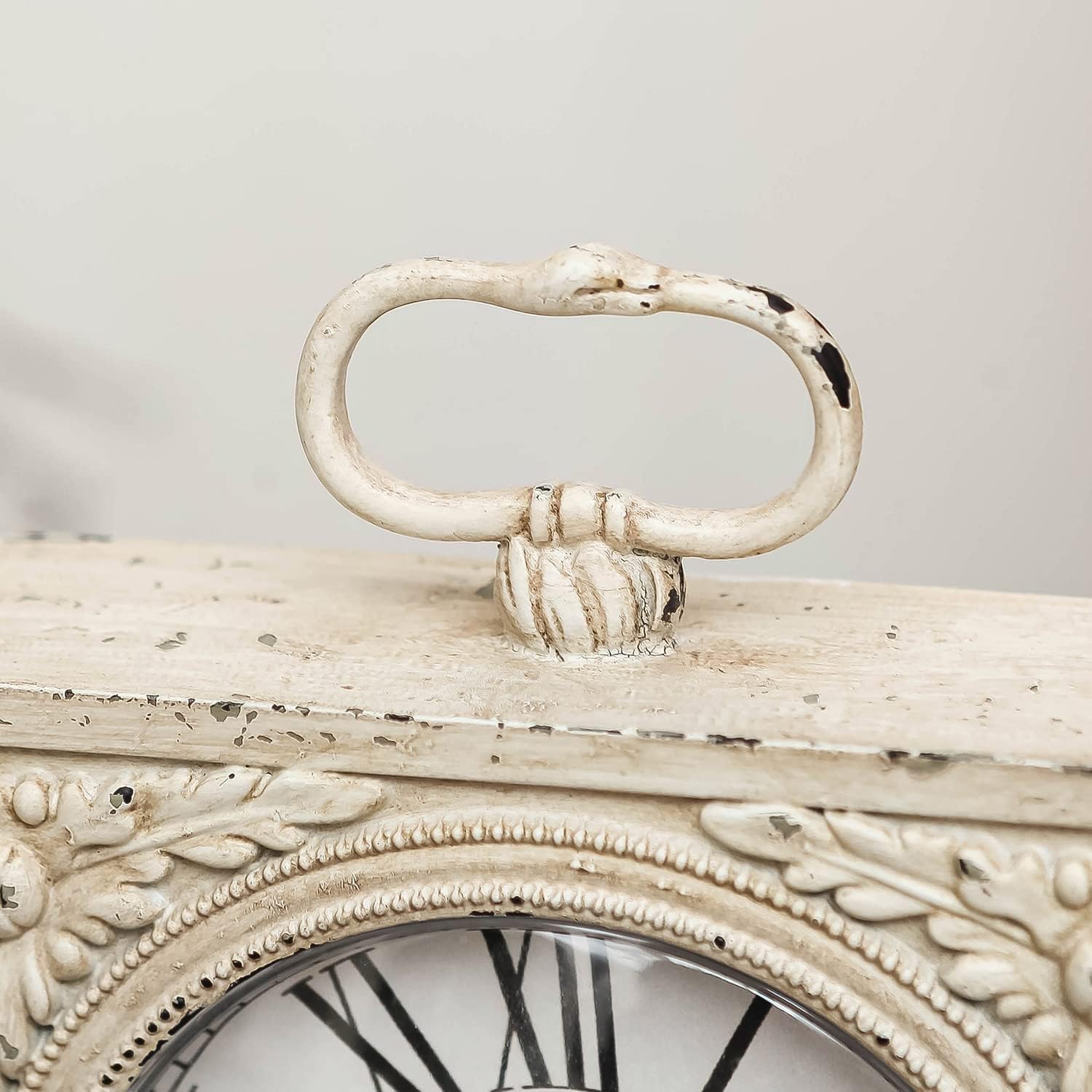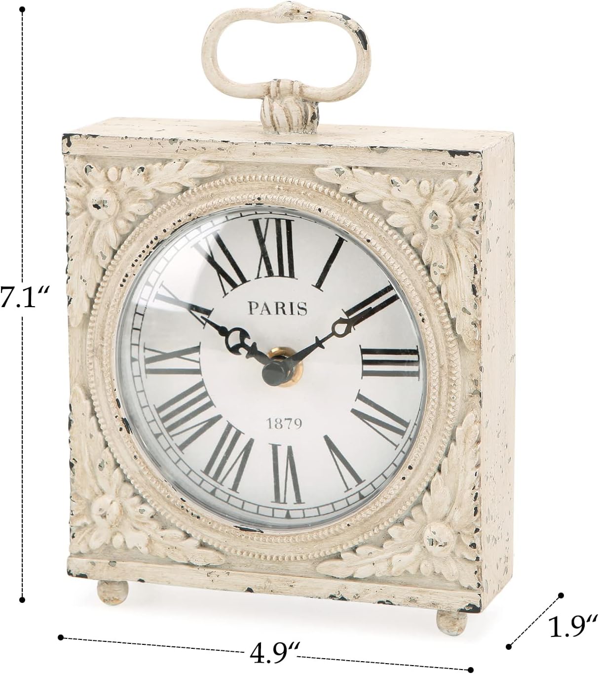 NIKKY HOME Small Table Clock with Handle, Silent Non-Ticking Shelf Desk Top Clock Battery Operated Vintage Rustic Design, Chic Home Decor for Fireplace Mantel, Desktop, Countertop, Distressed White