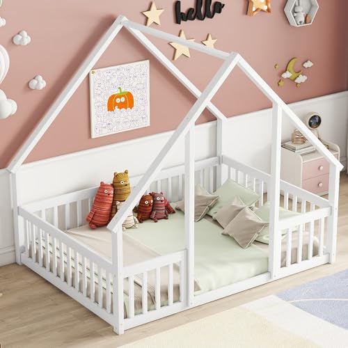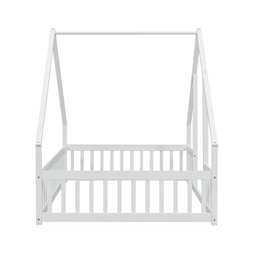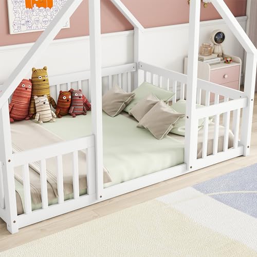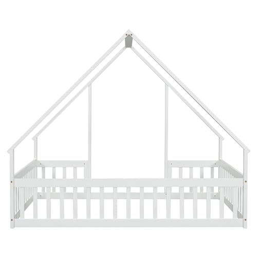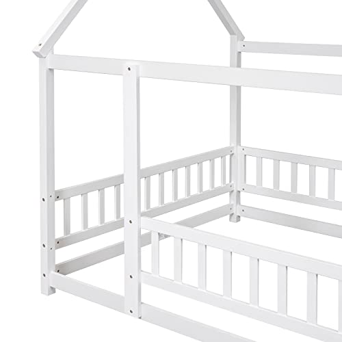 Unique Wooden Full Size House Shaped Floor Bed with Roof,Fence and Guardrails,for Kids Boys Girls Teens Bedroom Use (White@Fence, Full)