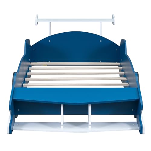 Twin Size Car Bed with Car-light shape LED & Pillow,Wooden Kids Bedframe W/Magazine Holder & Ceiling Cloth,Toy Bedroom Furniture for Boys Kids Toddlers Child,Natural