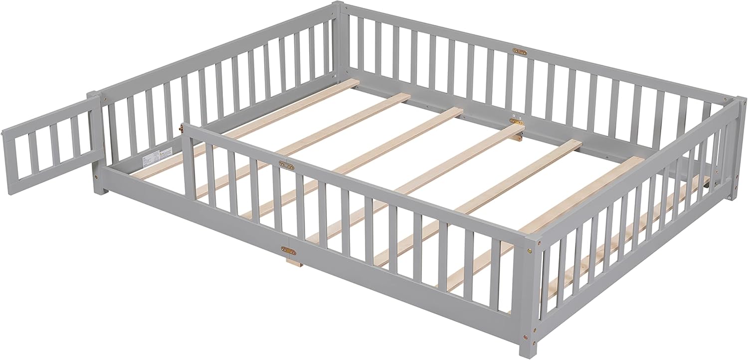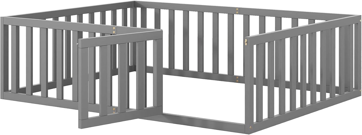Bellemave Floor Bed Queen Size Montessori Bed Frame with Fence and Door, Wooden Queen Platform Bed for Kids, Boys Girls, Solid Wood Queen Bed, No Box Spring Needed (Grey)