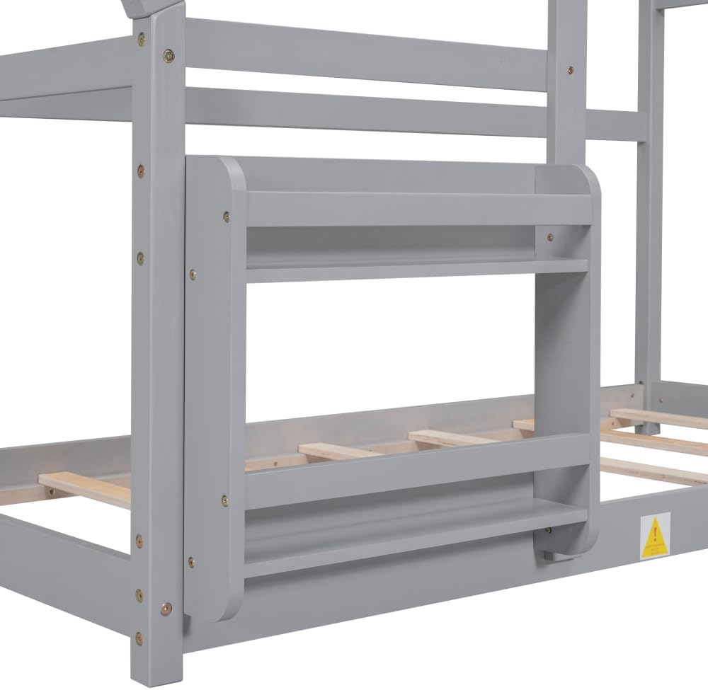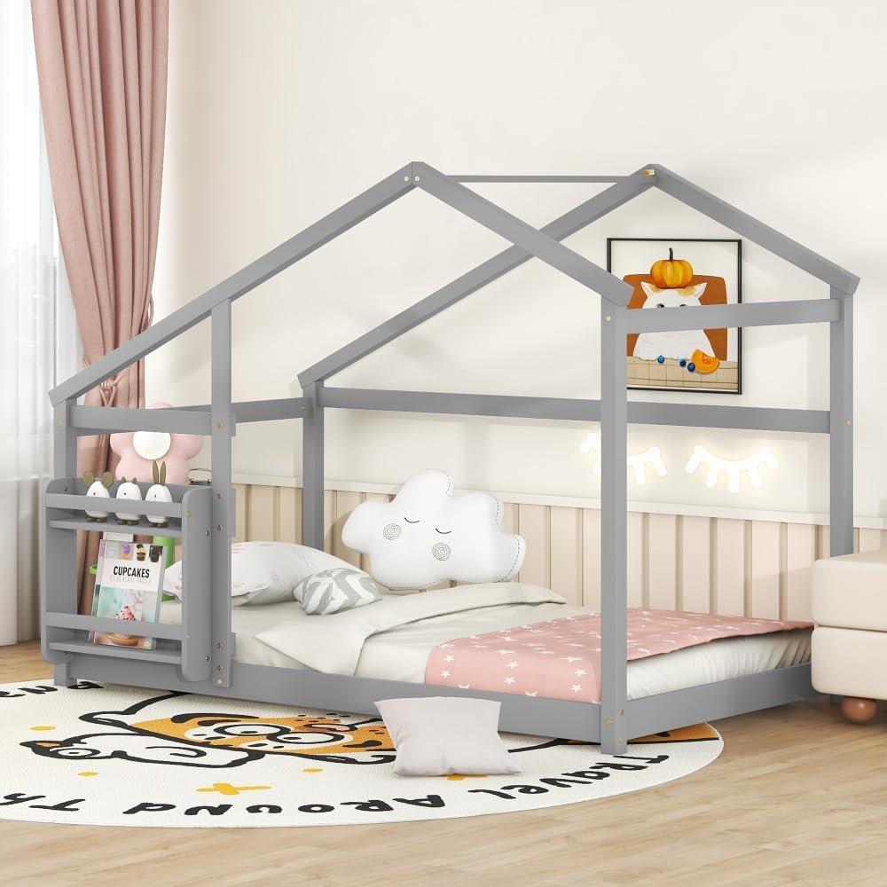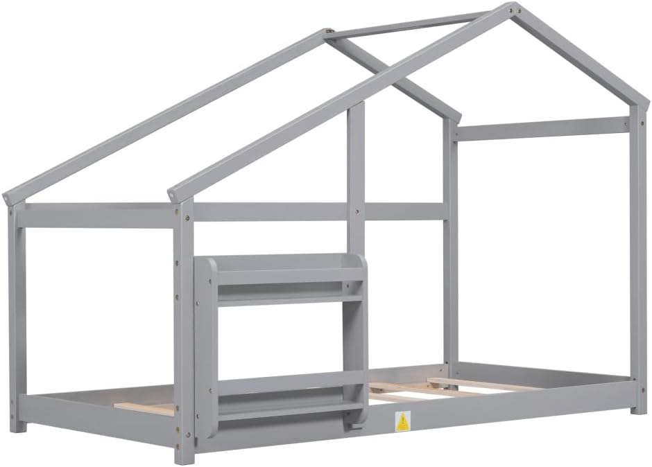 Twin Size Wooden House Bed, Twin Floor Wooden Bed with Shelf, No Box Spring Needed, Gray Color, Twin Bed Pine W69782587