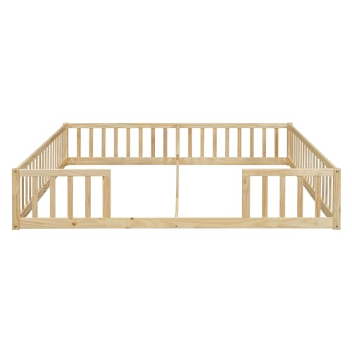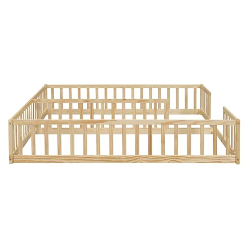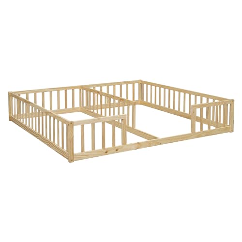 Double Twin Size Floor Bed with Fence, Wooden Floor Bed for 2 Kids with Guardrails,without Door, for Kids, Girls, Boys (Natural-@06)