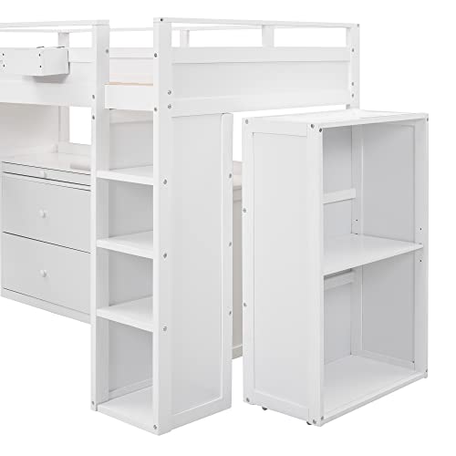 Twin Over Twin Floor Bunk Bed with Slide and Storage Stairs w/Drawers, Wooden Low Bunkbeds with Ladder and Guardrails, L-Shaped Design, for Kids Teens Bedroom, Gray