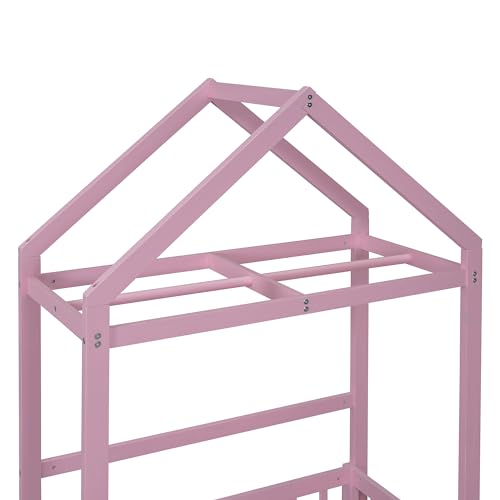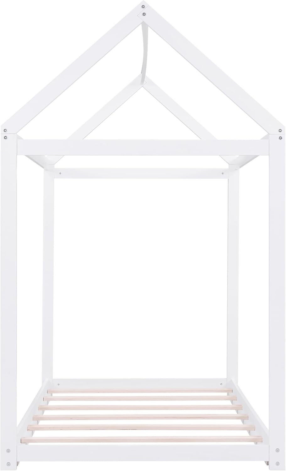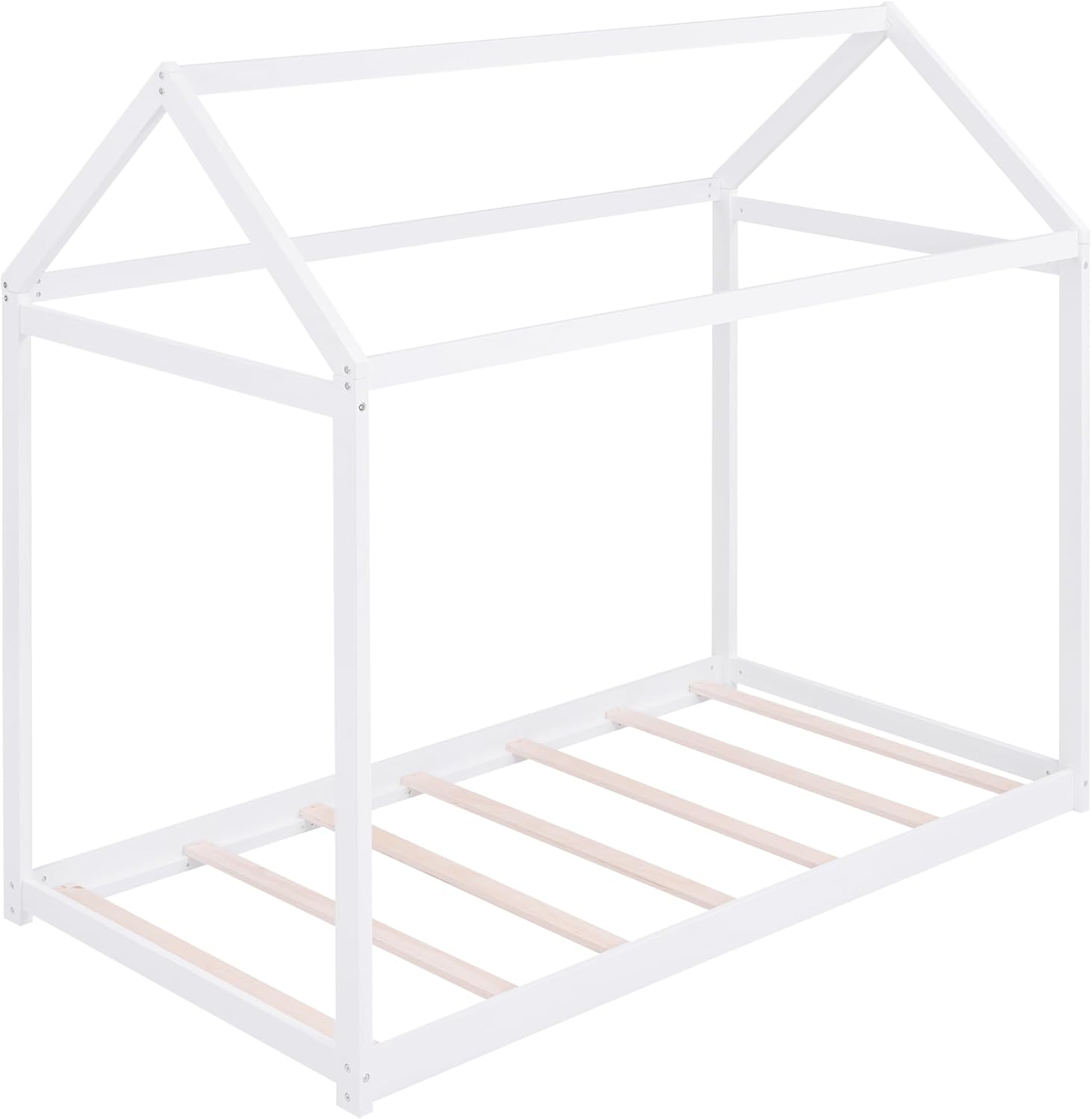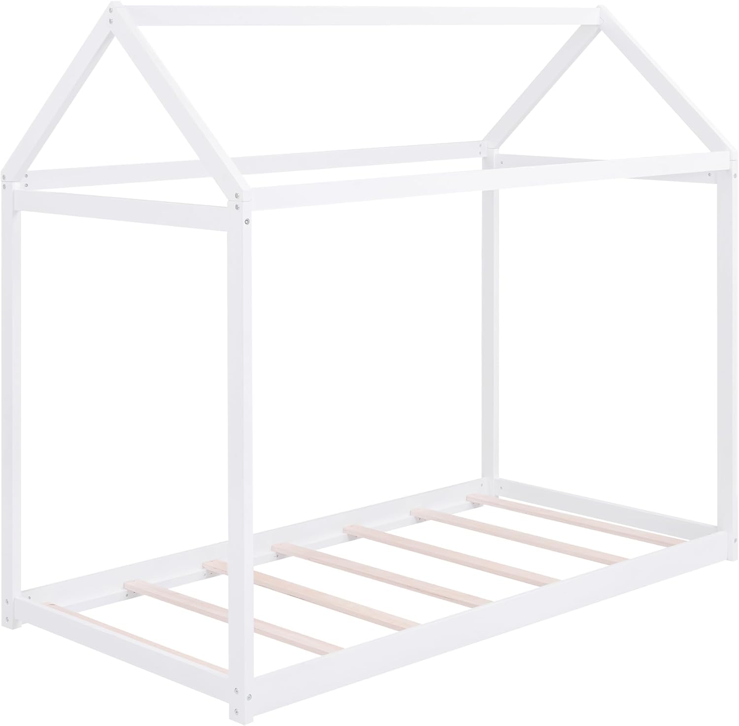 Twin Size House Shape Floor Bed, Montessori Wooden Slat Supports Bed Frame with Roof for Kids, Teens, Boys or Girls, White