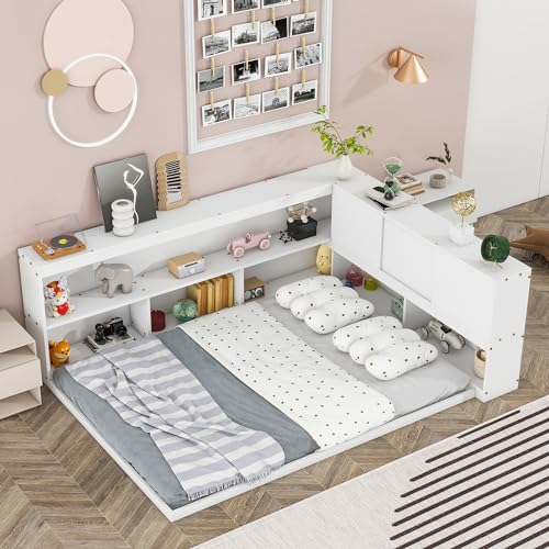 Full Size Floor Bed with Storage Shelves, Sliding Doors Cabinet, L-shape Bookcase, Wooden Bed Frame without Slats, Grey