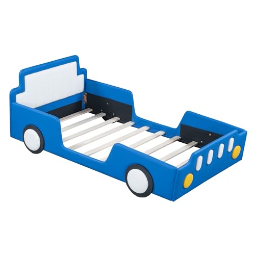 SOFTSEA Twin Size Car Shaped Platform Bed, Race Car Bed with Wheels for Boys Girls, Toddler Floor Bed Frame, Sturdy Wooden Slats, No Box Spring Needed, Easy Assembly (Red)
