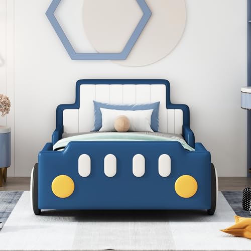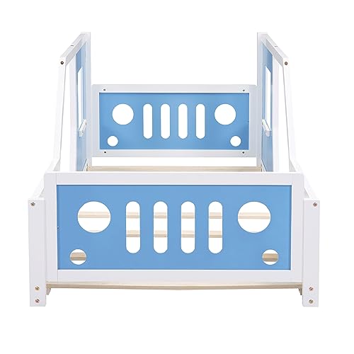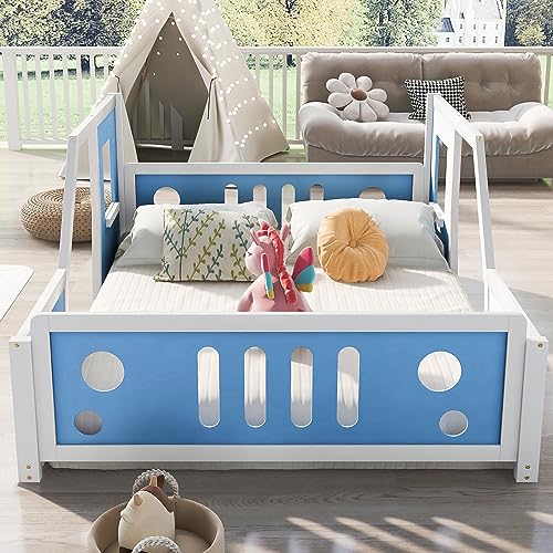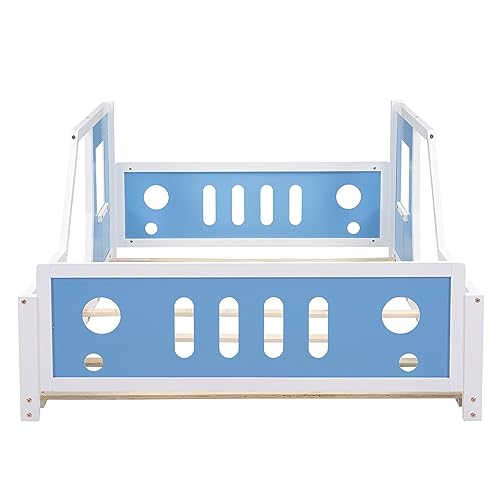 Full Size Classic Car-Shaped Platform Bed with Wheels,Wooden Floor Bedframe W/Door Design,Easy to Assemble,Toy Car Furniture for Boys Kids Toddlers Child's Bedroom,Blue