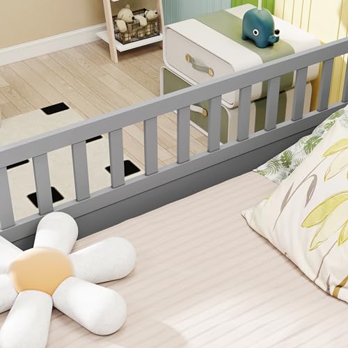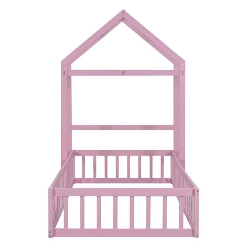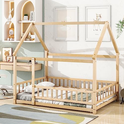 Full Size Montessori Floor Bed, Toddler Floor Wooden Bed with House Roof Frame, Fence Guardrails, Montessori Bed for Kids,Natural