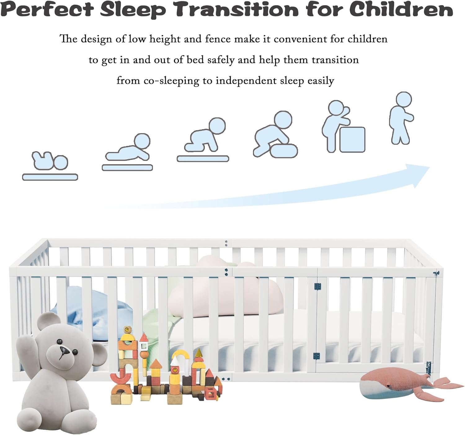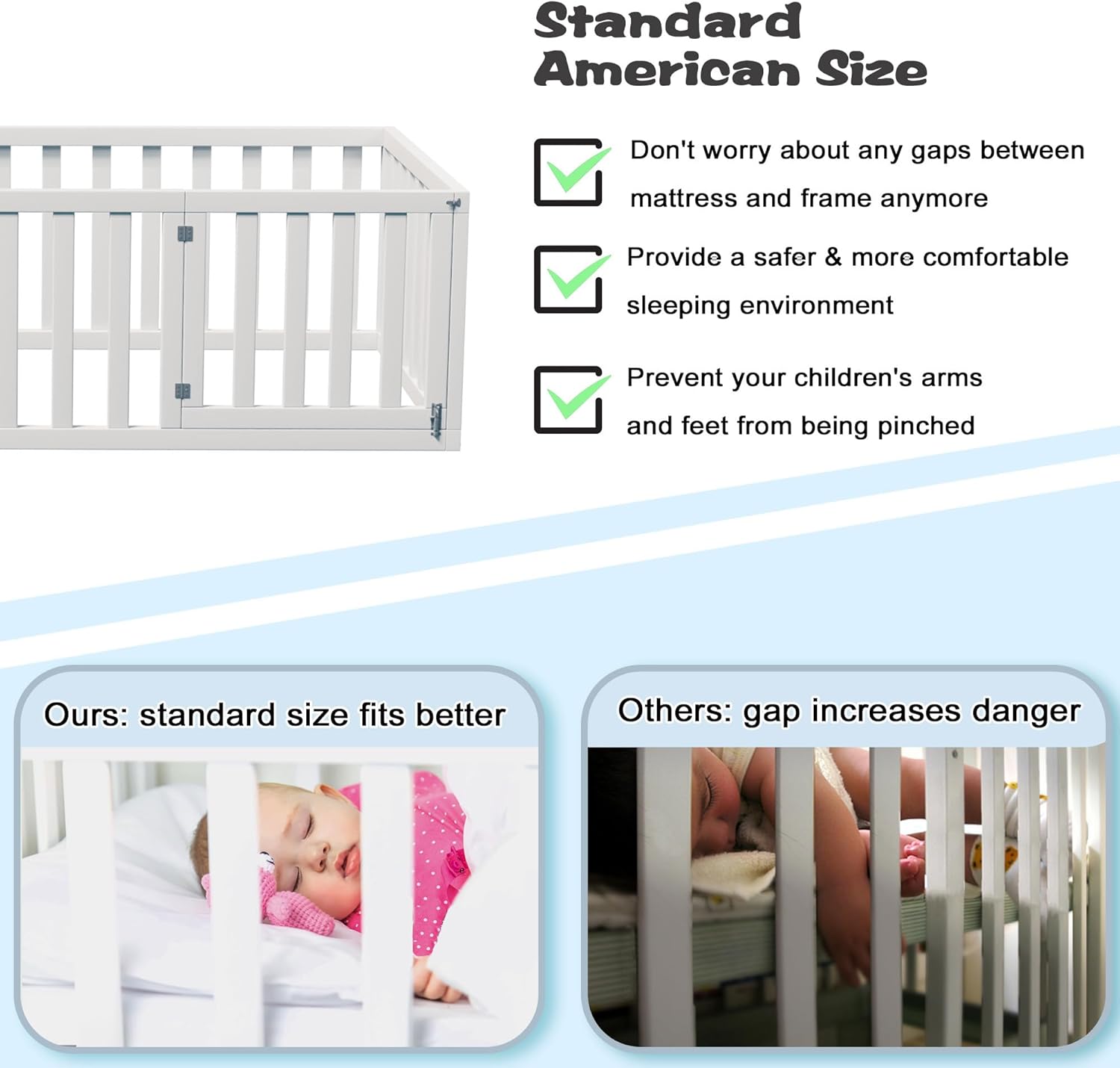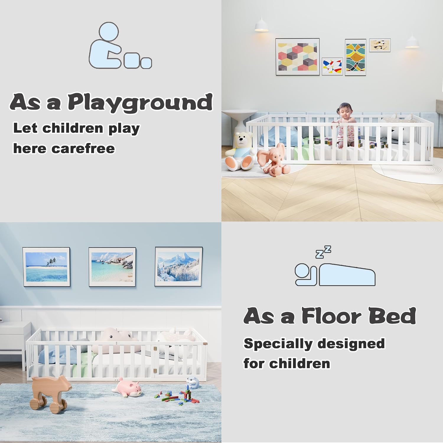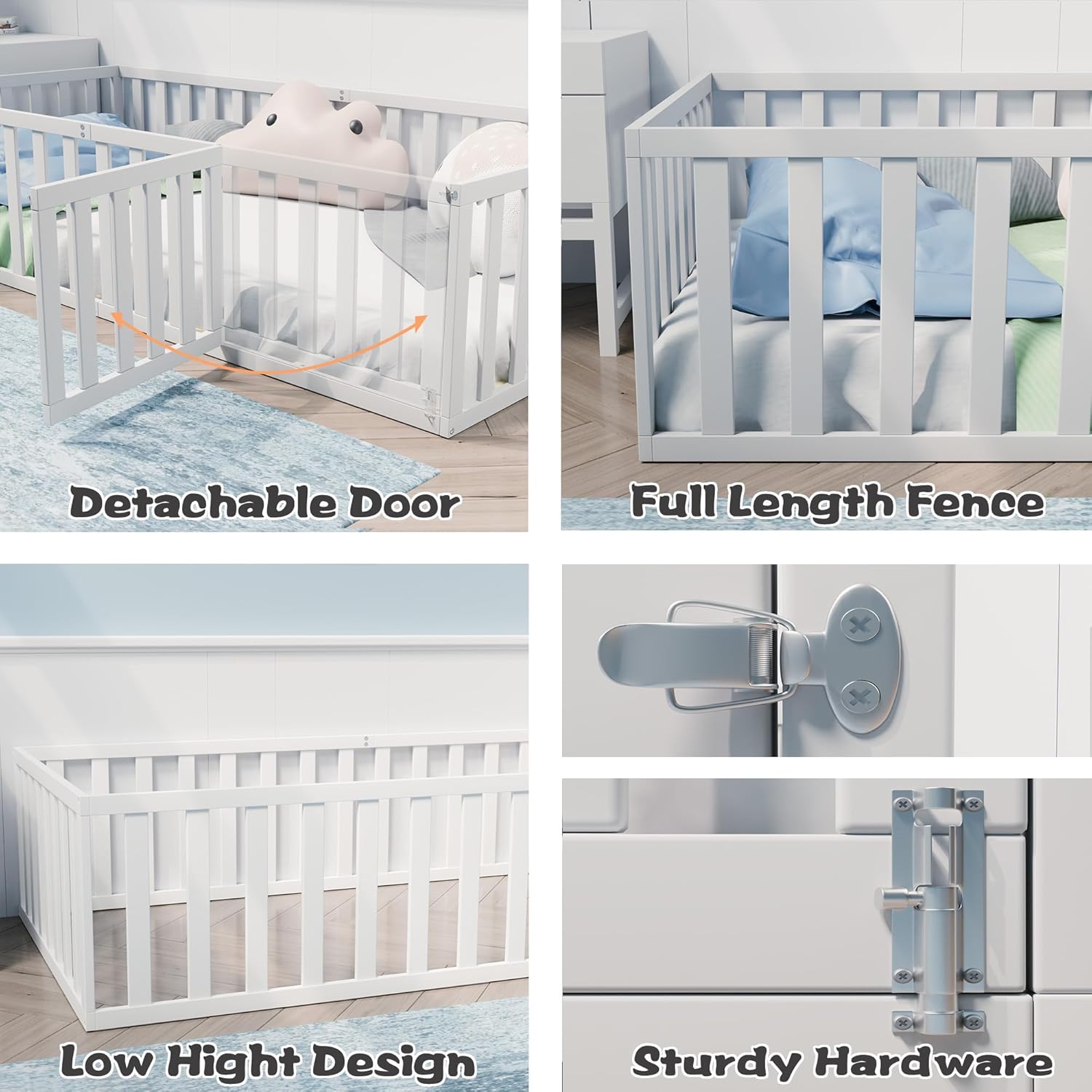Floor Bed, Wood Montessori Floor Beds with Guardrails & Detachable Door, Multifunctional Montessori Bed Frame for Boys Girls, Standard Size, No Weight Limit, Easy Assemble
