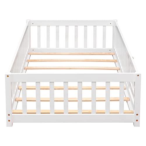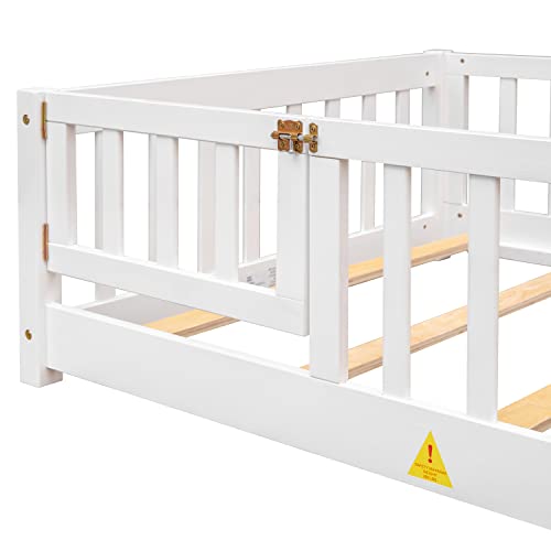 Twin Size Floor Platform Bed with Fence, Wooden Playpen Bed for Kids, Kids Fence Bed with Door, No Box Spring Needed (White)