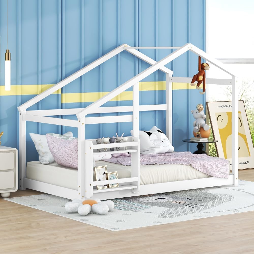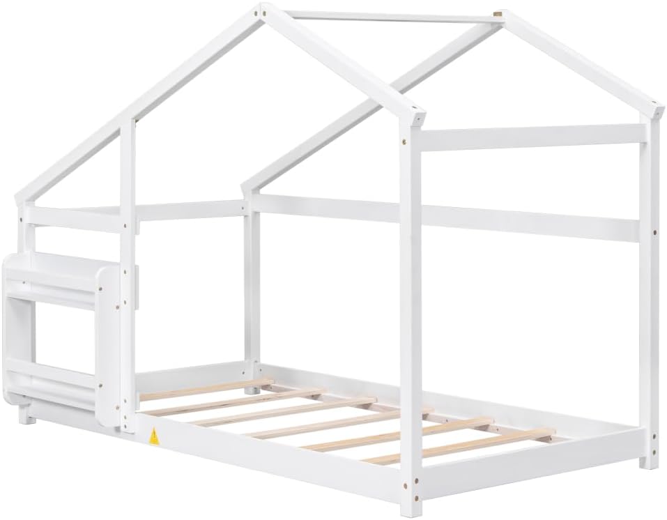 Twin Size Wooden House Bed, Twin Floor Wooden Bed with Shelf, No Box Spring, White Color, Twin Bed Pine W69782586