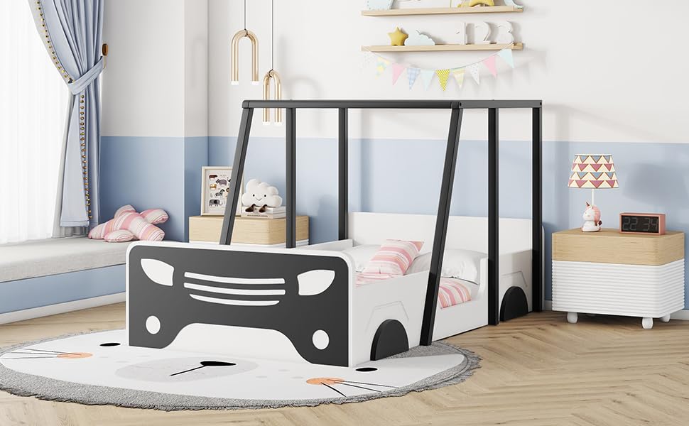 Majnesvon Designs Twin Car Bed Frame with Roof,Wooden Twin Floor Bed with Wheels and door Design for Boys Girls Child's Bedroom (Grey)