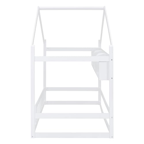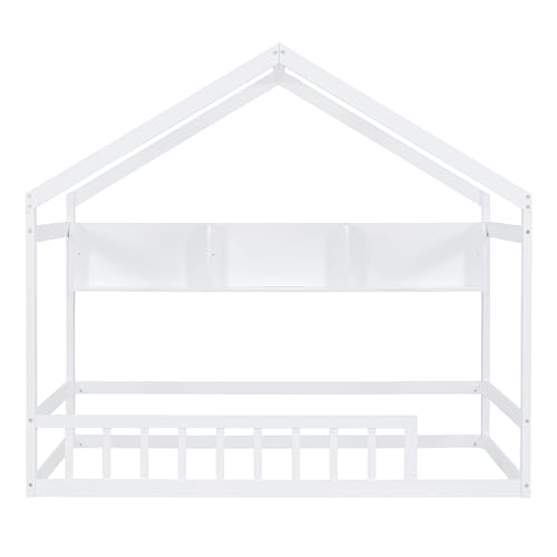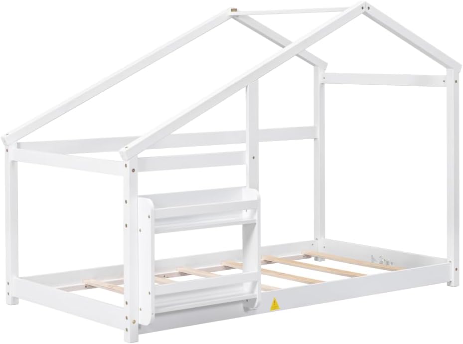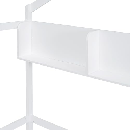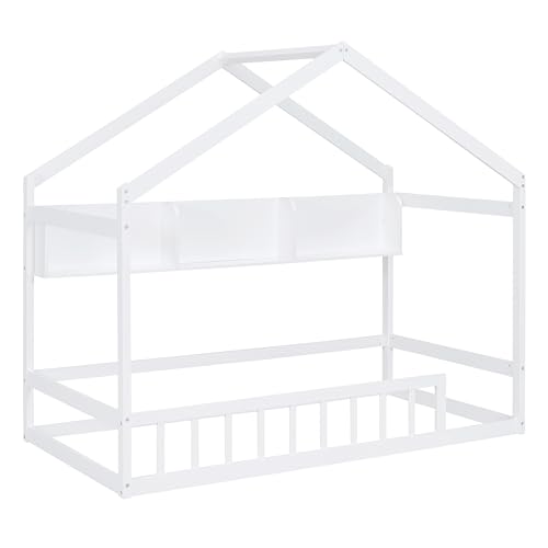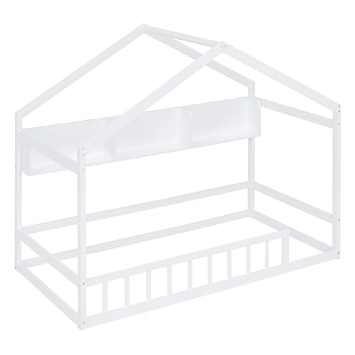 Merax Kids House Bed, Twin Size Wooden Bed Frame with Fence, Roof and Storage Shelf for Kids Teens Adults, Wood Slat Support, No Box Spring Needed, Easy Assembly, White