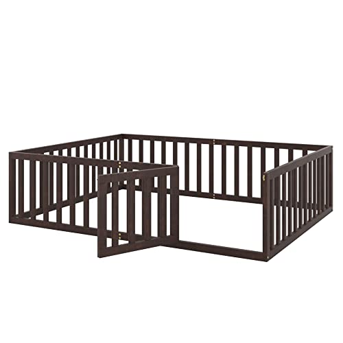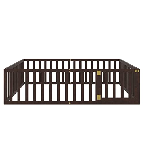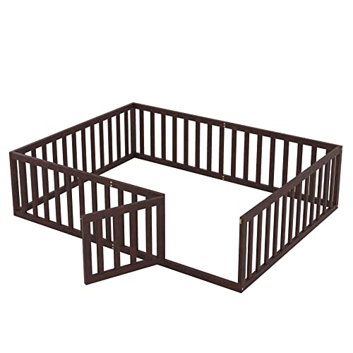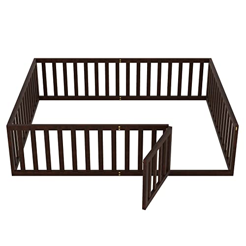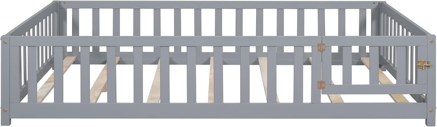 Bellemave Queen Floor Bed for Kids, Montessori Bed Frame with Fence-Shaped Guardrails and Door, Wooden Floor Queen Bed for Kids, Toddler, Boys Girls(Gray, Queen Size)