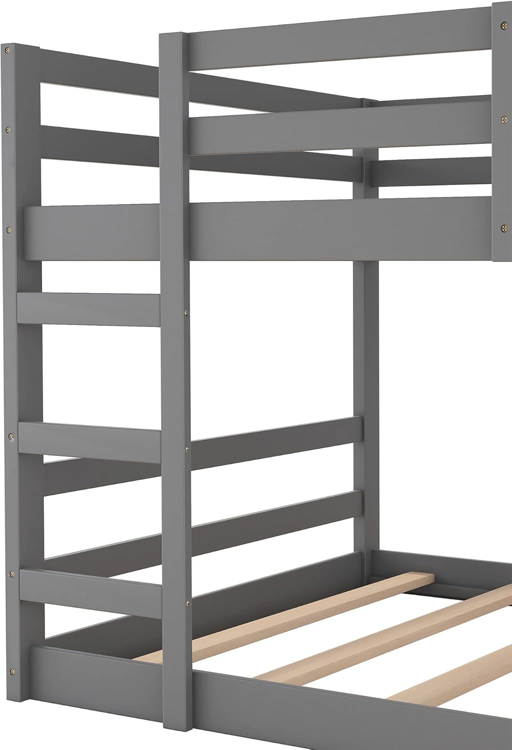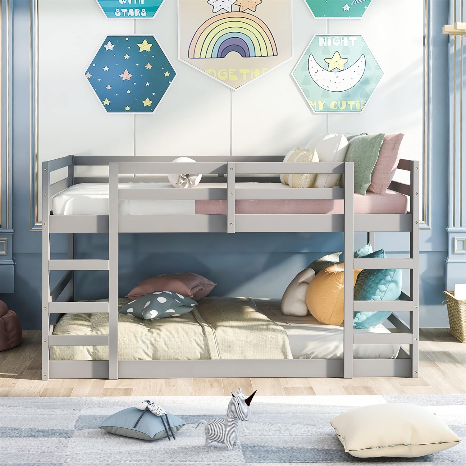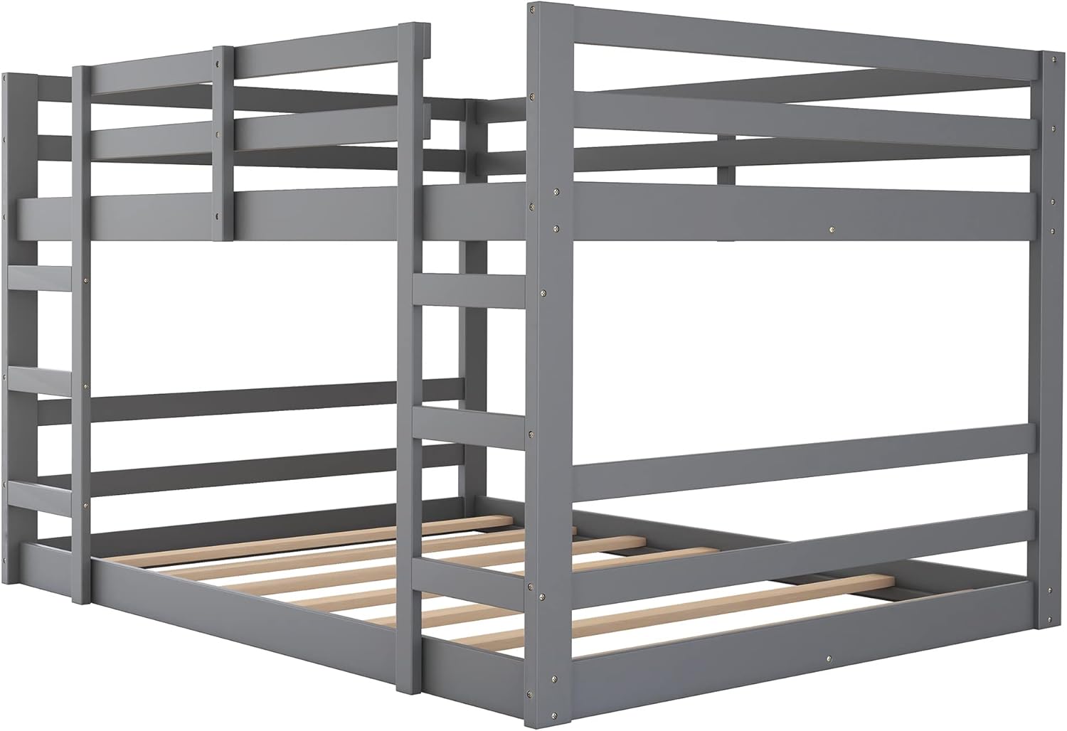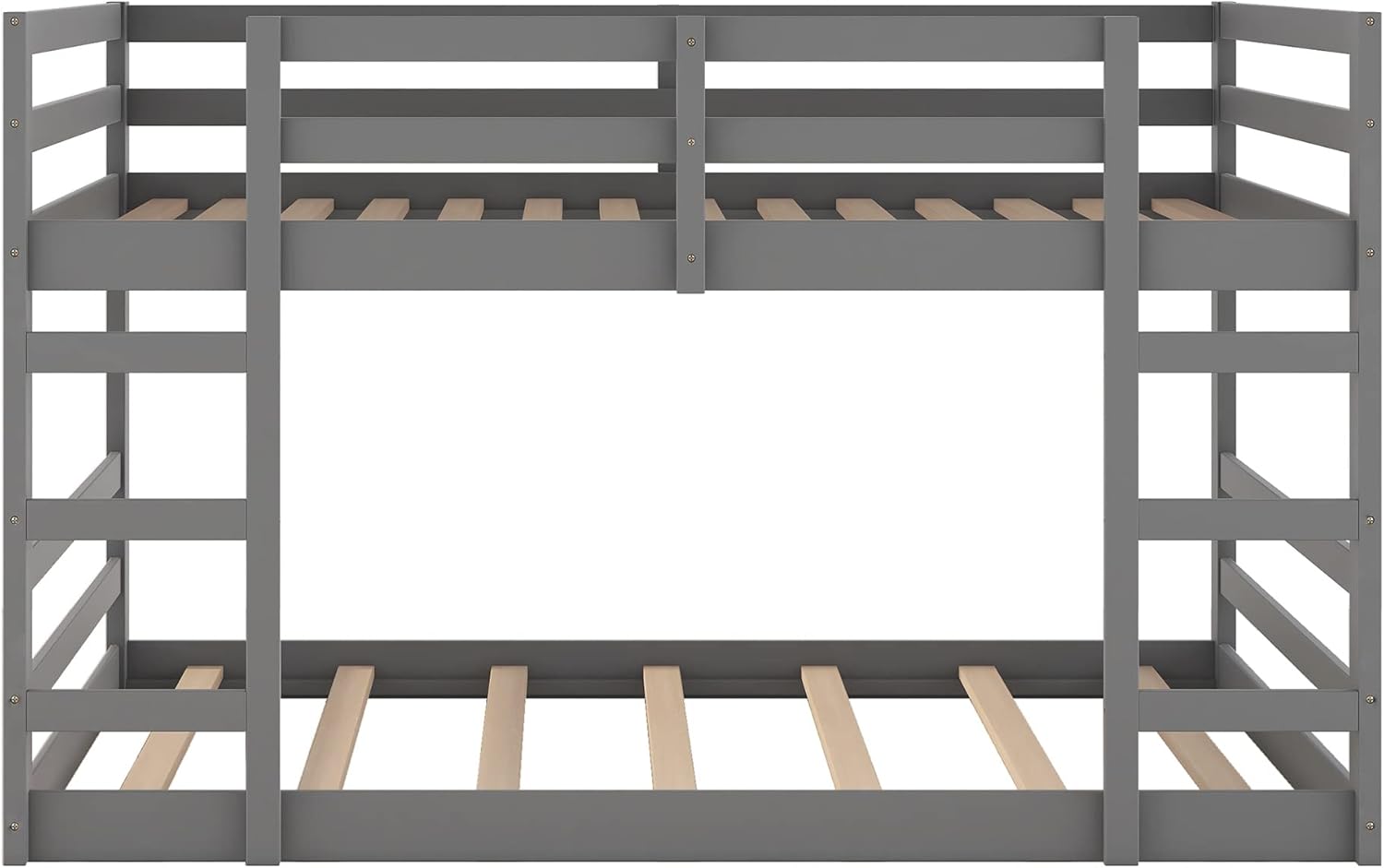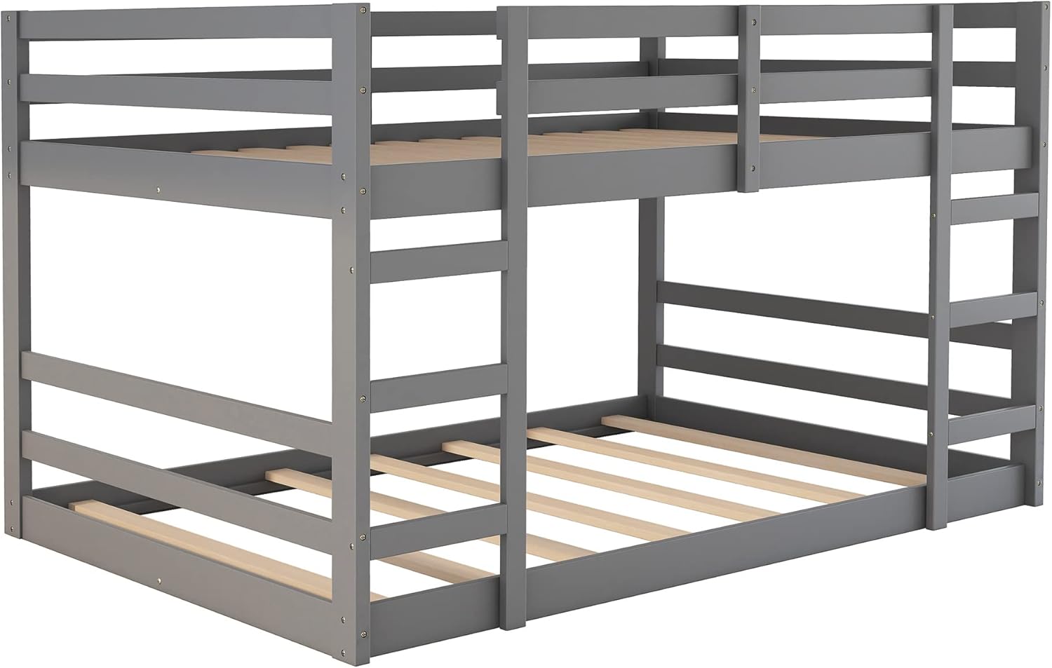 Full Over Full Low Bunk Bed, Solid Wood Floor Bunk Bed with Ladder, for Toddlers Kids Boys Girls (Gray)