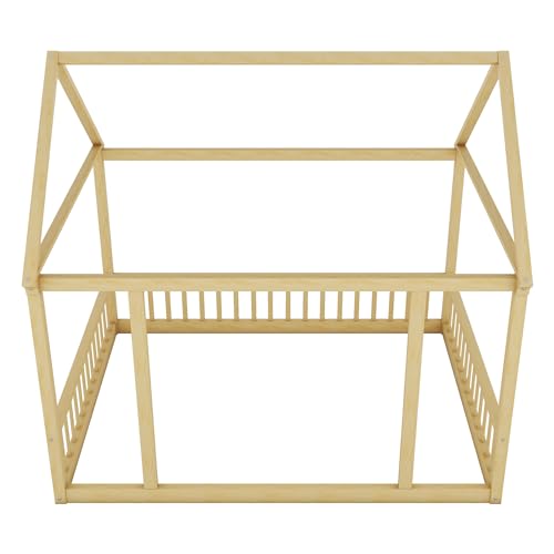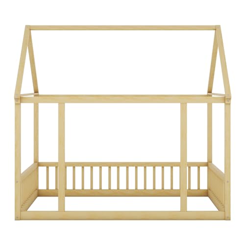 Twin Floor Bed for Kids, Twin Size Montessori Floor Bed with Safety Guardrails and Roof, Wooden House Bed Frame without Slats for Girls Boys, White