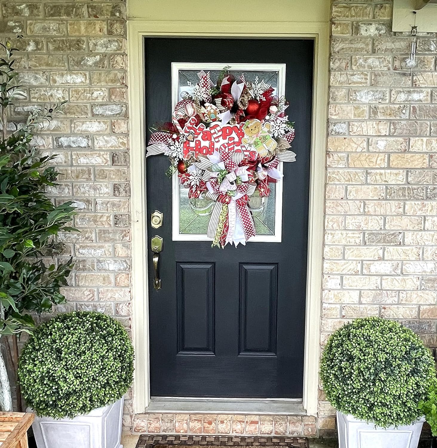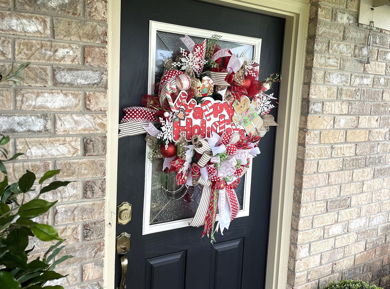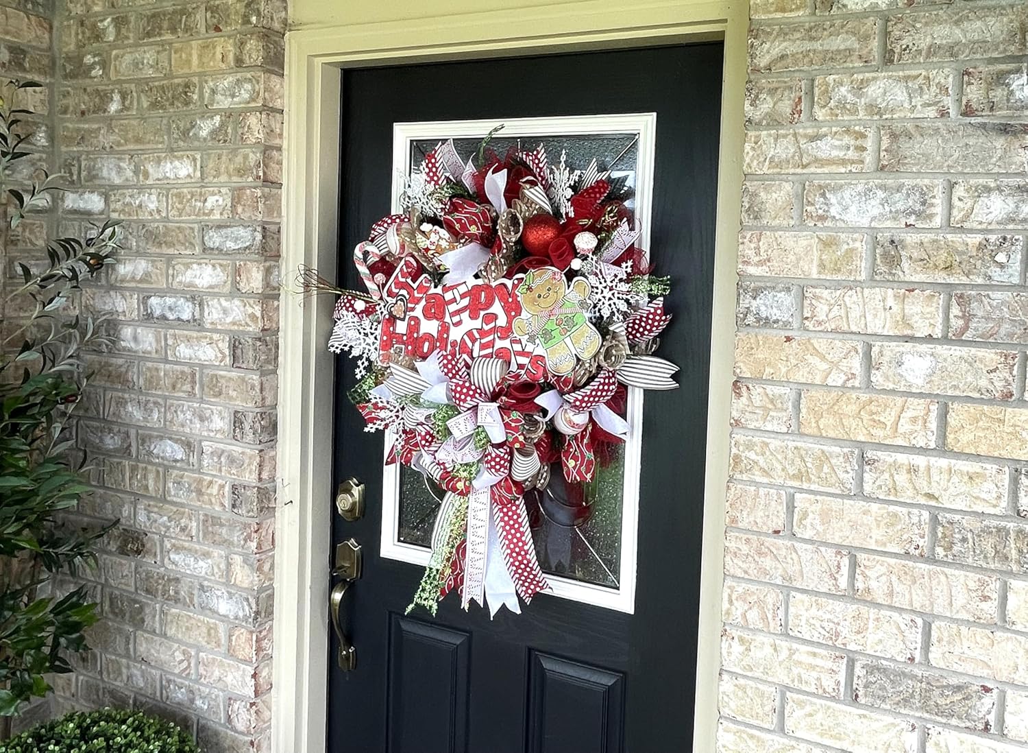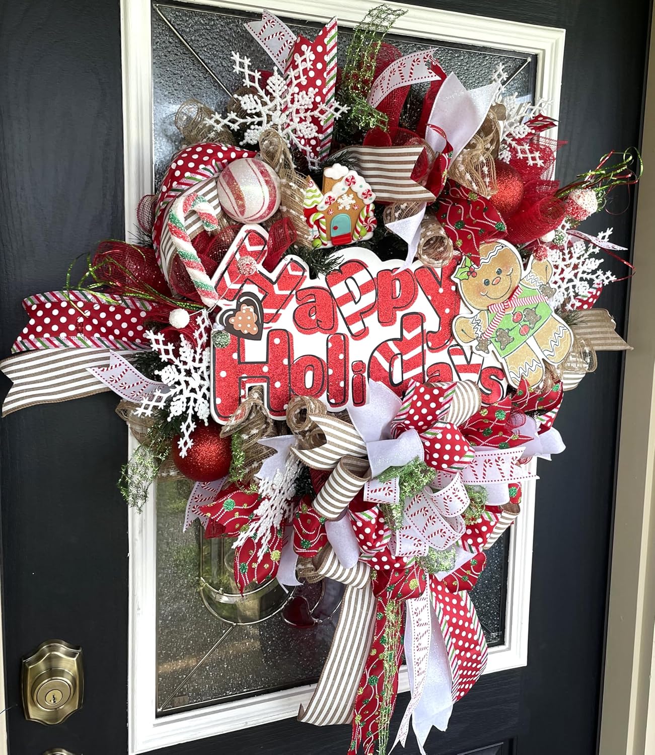 Over The Top XL Gingerbread Christmas Wreath, Front Door, Deco Mesh & Ribbon, Handmade, Porch Patio Decoration, Indoor Outdoor, Green, Red, Brown, White