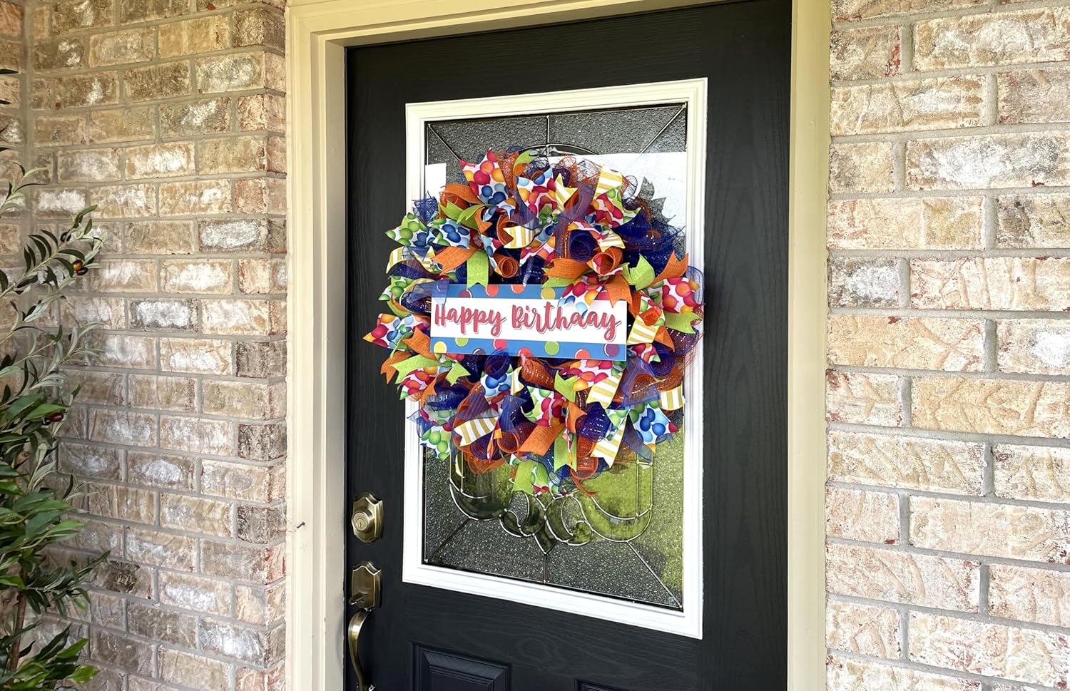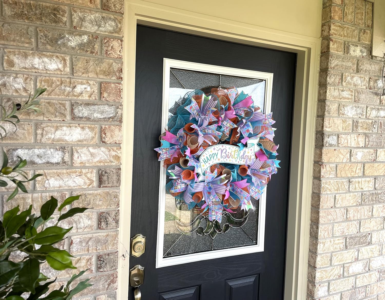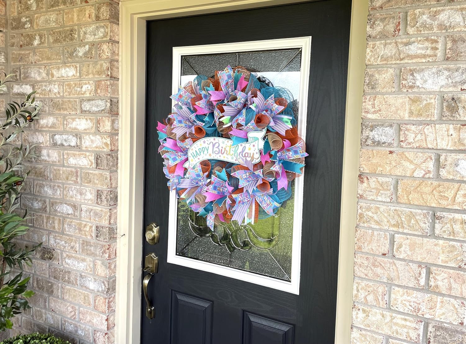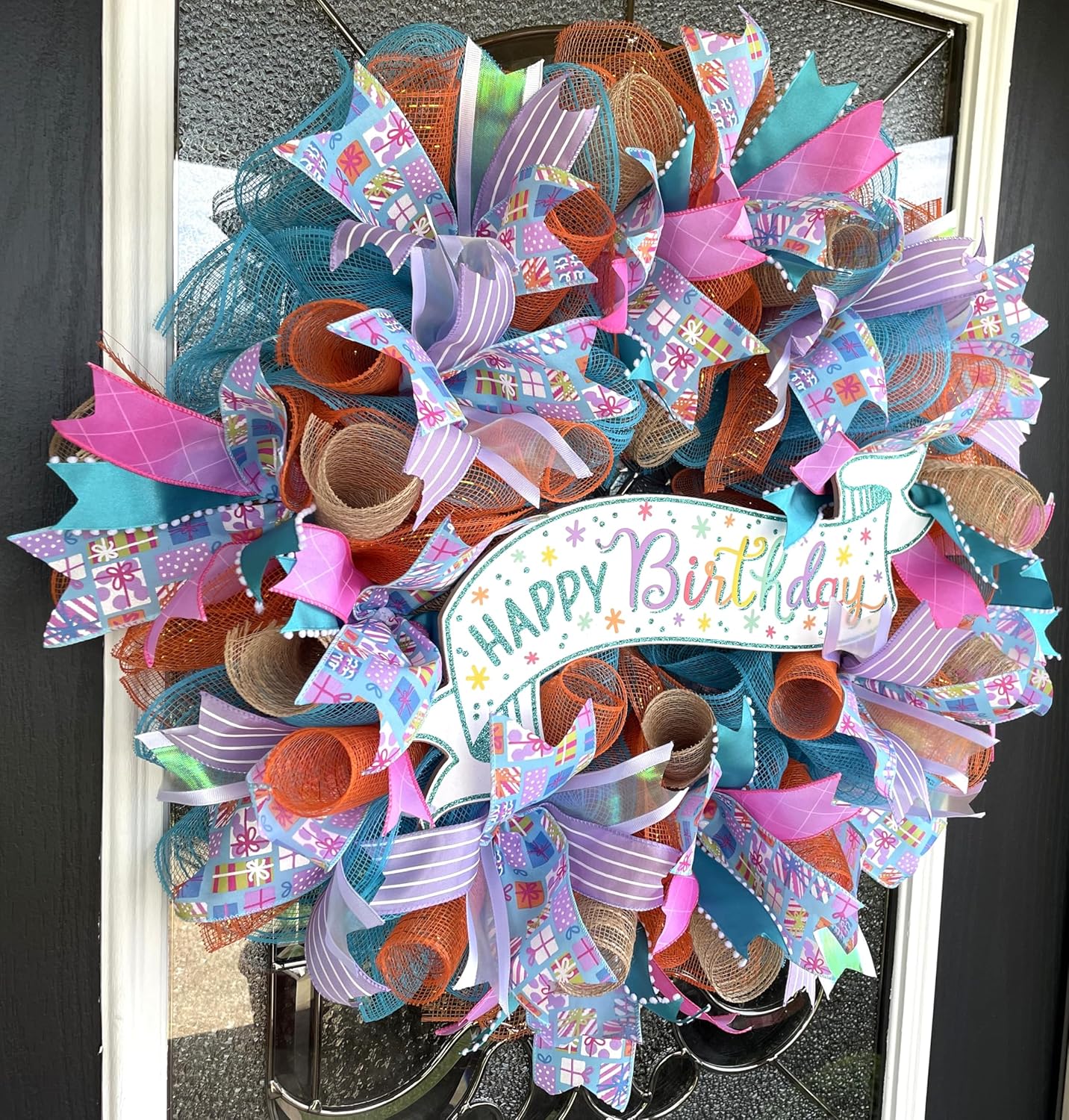 Beautiful Happy Birthday Glitter Sign Wreath Present Gift Ribbon Deco Mesh Front Door Wreath Home Holiday Decor Fun Festive Indoor Outdoor, Porch Patio Decoration