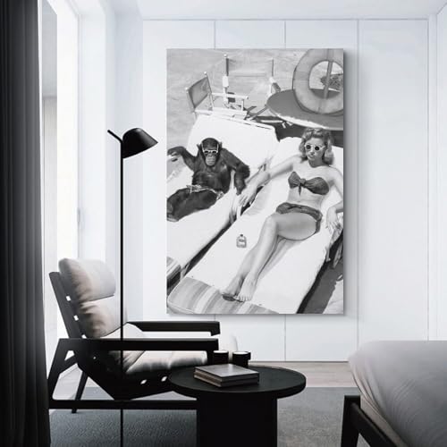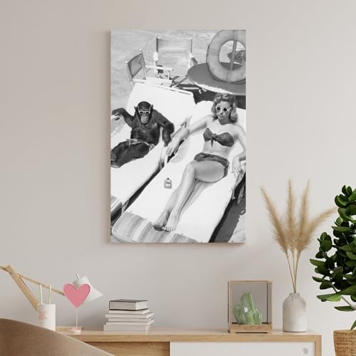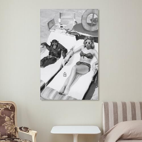 HMBNIUN Interesting Black And White Vintage Photo Of A Woman Sunbathing Near A Chimpanzee Wall Art Posters For Room Aesthetic Pictures For Living Room Bedroom Decor 24x36inch(60x90cm)