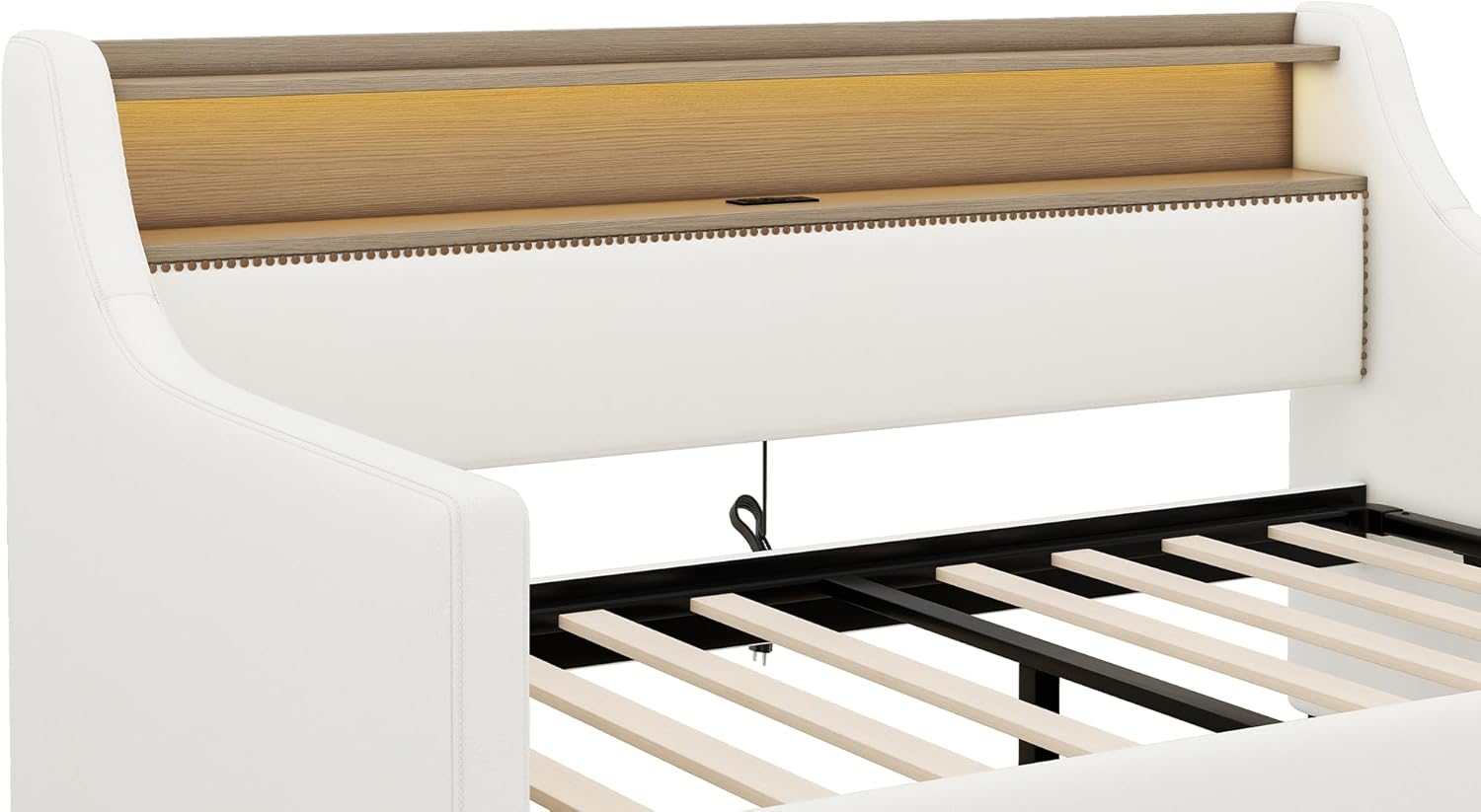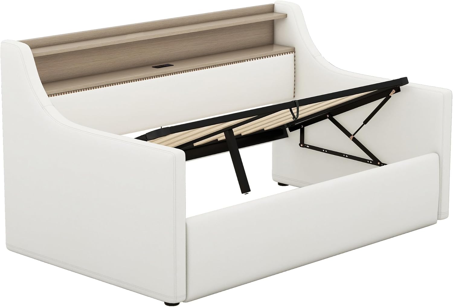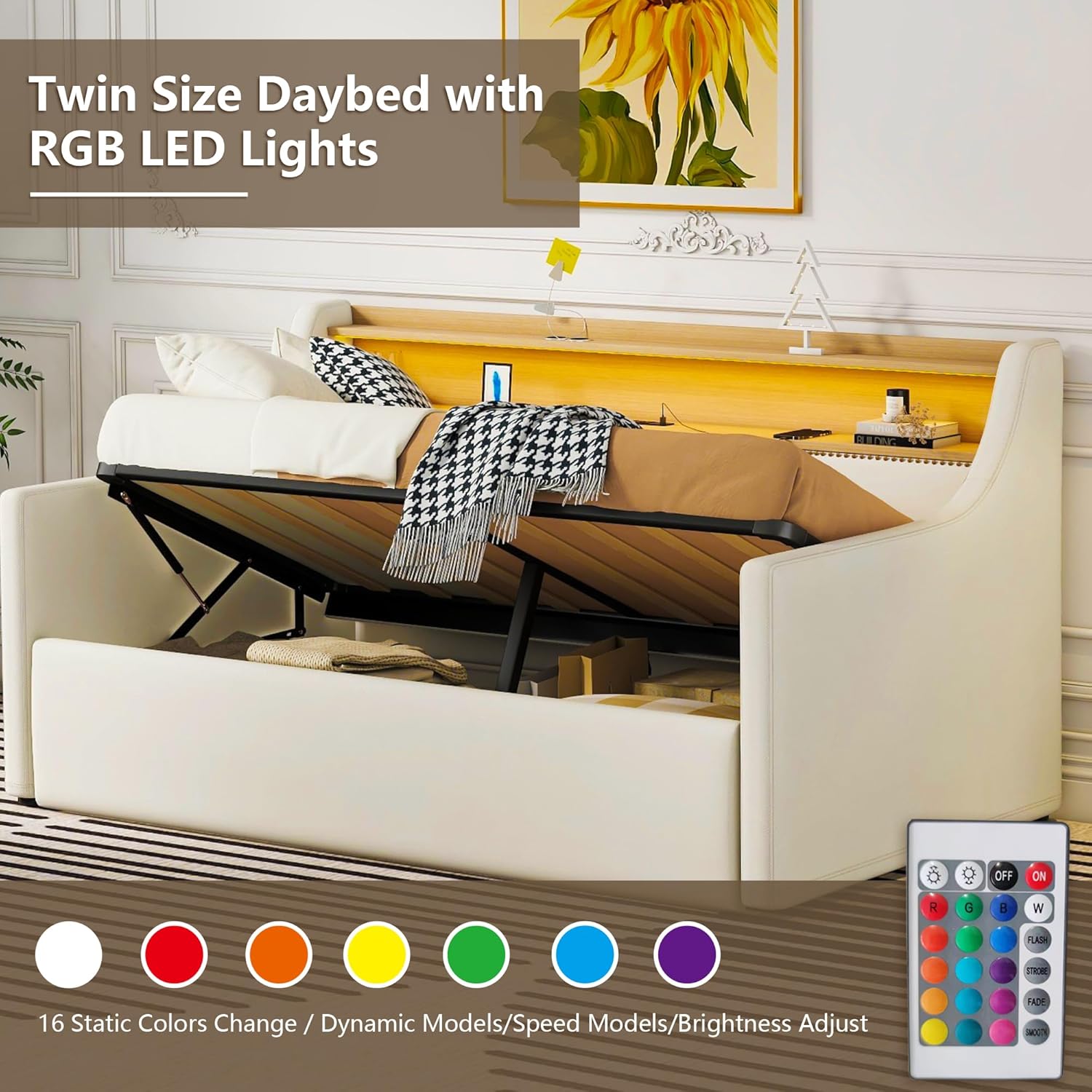 Twin Size Daybed Frame with Hydraulic Storage,Upholstered Daybed with Charging Station and LED Lights,Wood Sofa Bed Frame with Lift Up Storage for Bedroom,Living Room,Guest,(White)