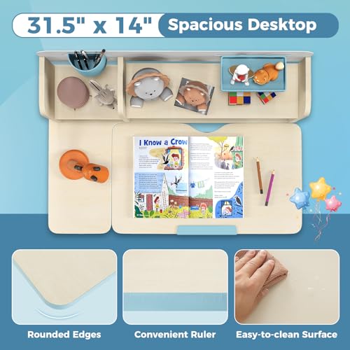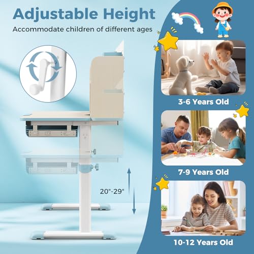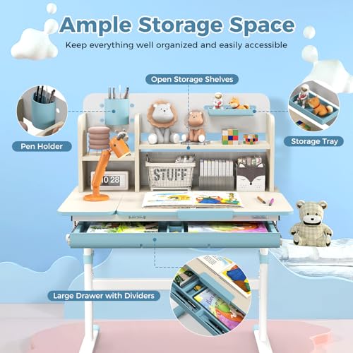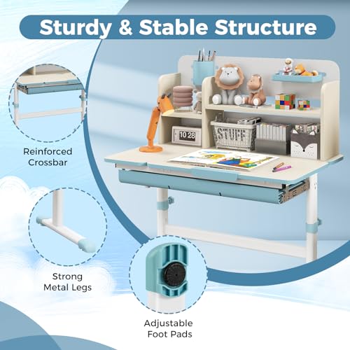 HONEY JOY Kids Desk, Children School Study Desk w/ 7-Level Tiltable Desktop, Height Adjustable Table w/Bookshelf, Pull-Out Drawer & Pen Holder, Student Writing Workstation, Desk for Girls Boys (Pink)
