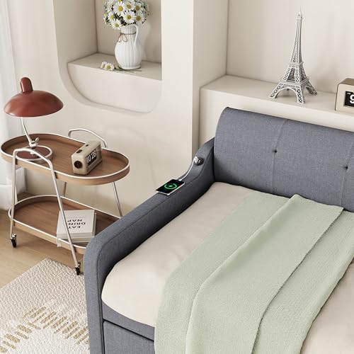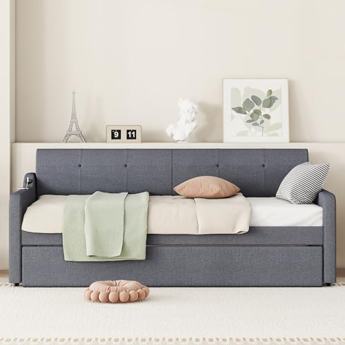 Twin Size Daybed Frame with Pop up Trundle,Upholstered Day Bed with Charging Station,Daybed with Trundle Bed Twin,Wood Sofa Bed Frame with USB for Bedroom,Living Room,Guest,Office,Twin,Beige
