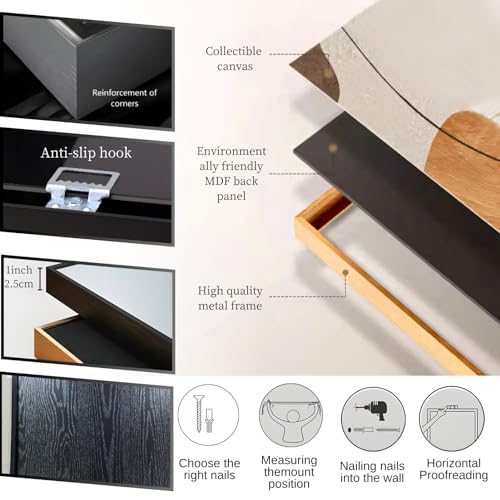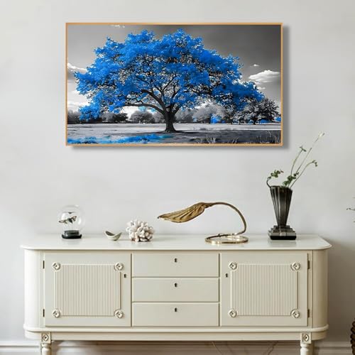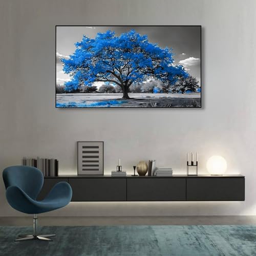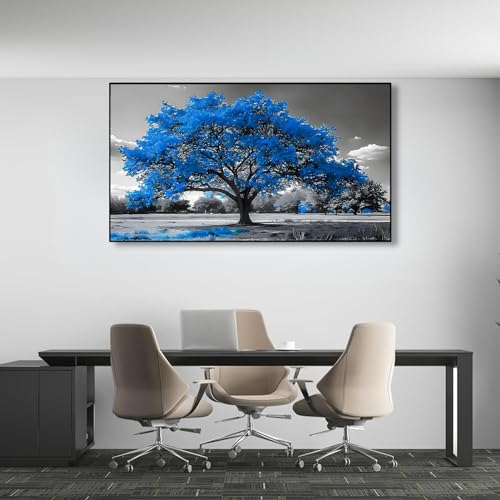 Canvas Wall Art, Blue Tree Wall Art, Large Tree of Life Wall Art, Black and White Floral Wall Art, Modern Giclee Stretched and Framed Wall Art Living Room Bedroom (Black Framed, 48" Wx27 H/122x68cm)