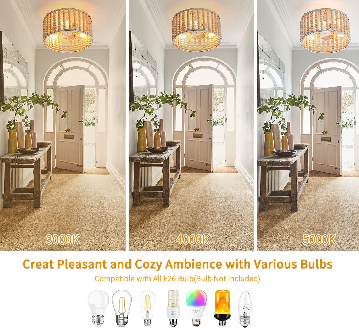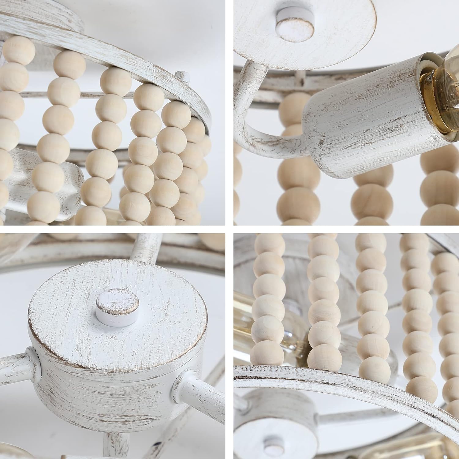 tewei Wood Beaded Boho Chandelier Light Fixture, Semi Flush Mount Ceiling Light 3-Light Rustic Nursery Close to Ceiling Light for Bedroom Kitchen, Living Room, Oak White, E26 Base