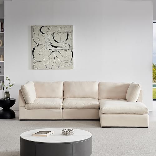 Tian Modern Minimalist Style L-Shaped Sectional Sofa Set, Luxury Large Linen Upholstery Modular Cloud Couch with Convertible Ottoman Chaise (Beige, L-Shaped Short Back)