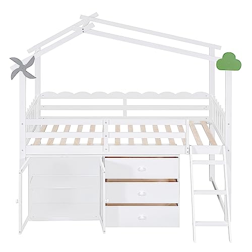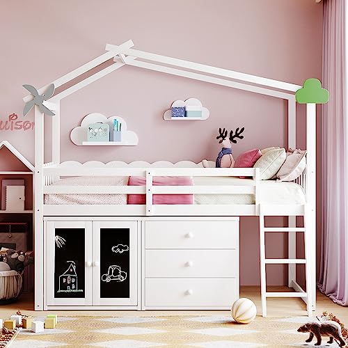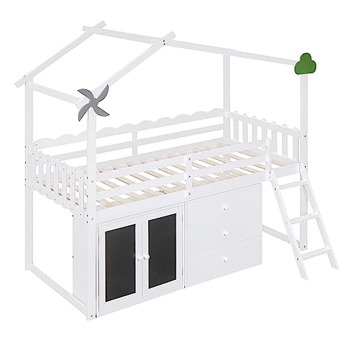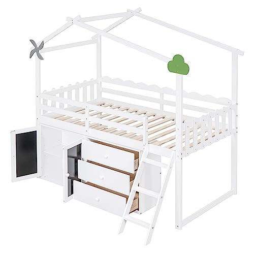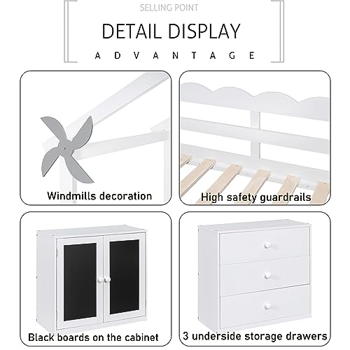 CITYLIGHT Twin Size House Loft Bed with Storage Cabinet and 3 Drawers, Wood Loft Bed Twin with Roof, Blackboards and Guardrail, Kids Playhouse Bed Twin for Teens, Boys, Girls, Grey