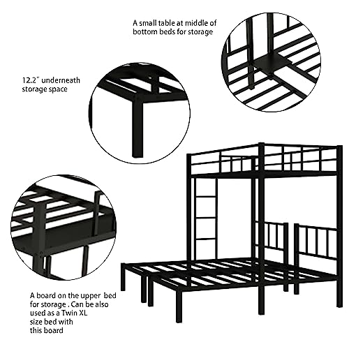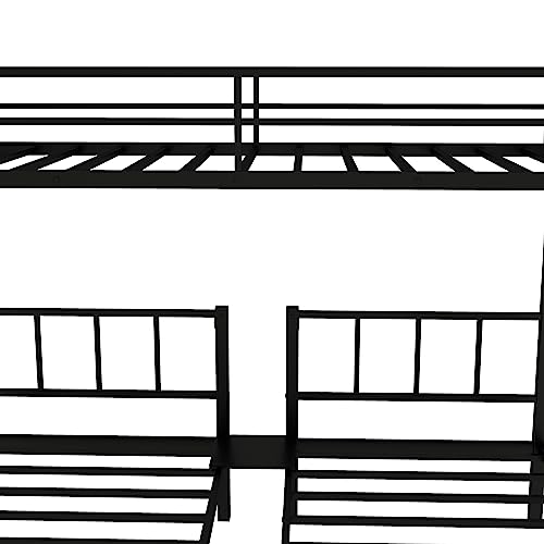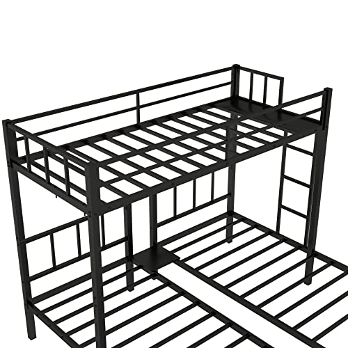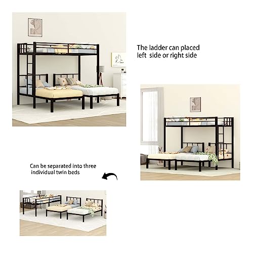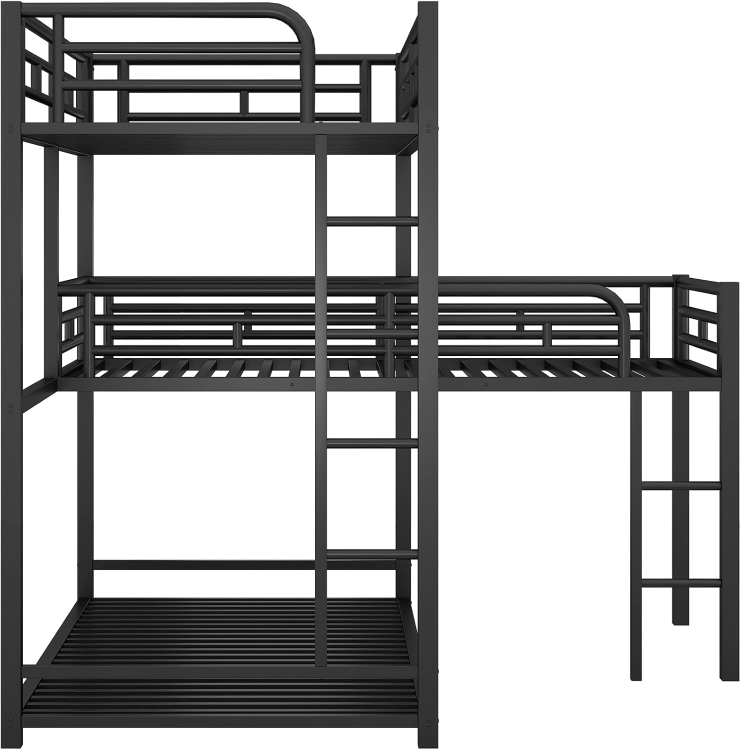 L-Shaped Triple Bunk Bed, Heavy Duty Metal Twin Size Bunk Bed with Ladder and High Guardrail, Triple Bunk Bed for 3 Kids Teens Adults, Space Saving, No Box Spring Needed, Black