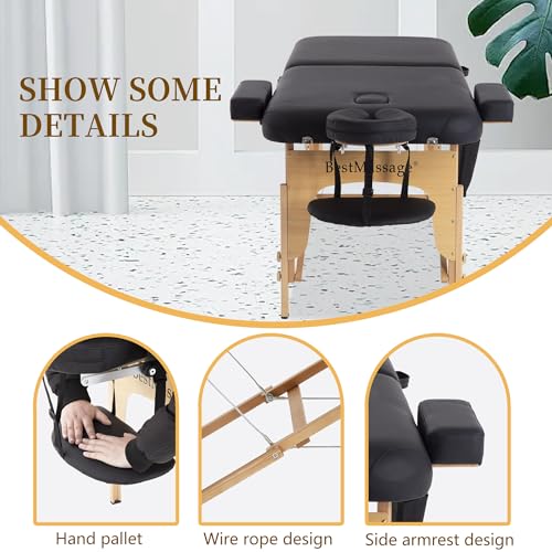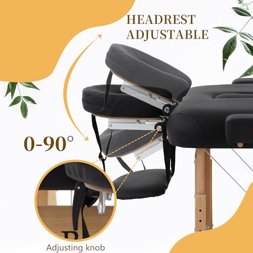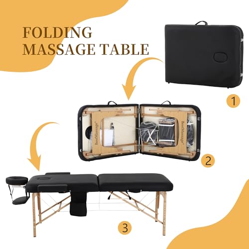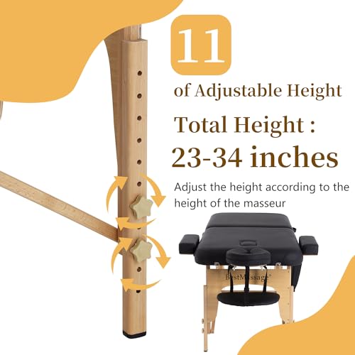 Massage Table 2 Fold Massage Bed 73"x28" PU Spa Bed Portable Massage Table Height Adjustable Lightweight Spa Table with Half Bolster Sheet Side Pocket Carry Case (Black)