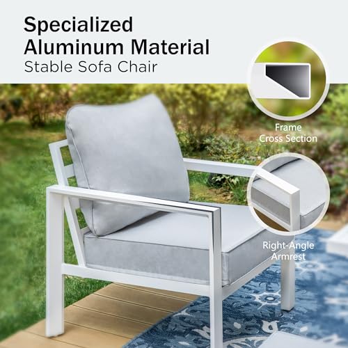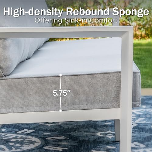 PHI VILLA 5 Pieces Metal Patio Furniture 7 Seat Set Aluminum Outdoor Cushioned Sofa, 2 x Armrest Chair, 2 x Ottoman, 1 x 3-Seat Sofa, Outdoor Light Grey Conversation Set