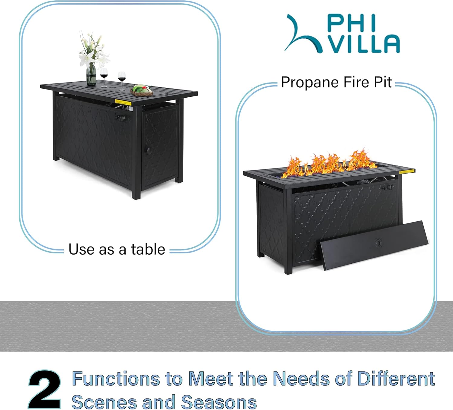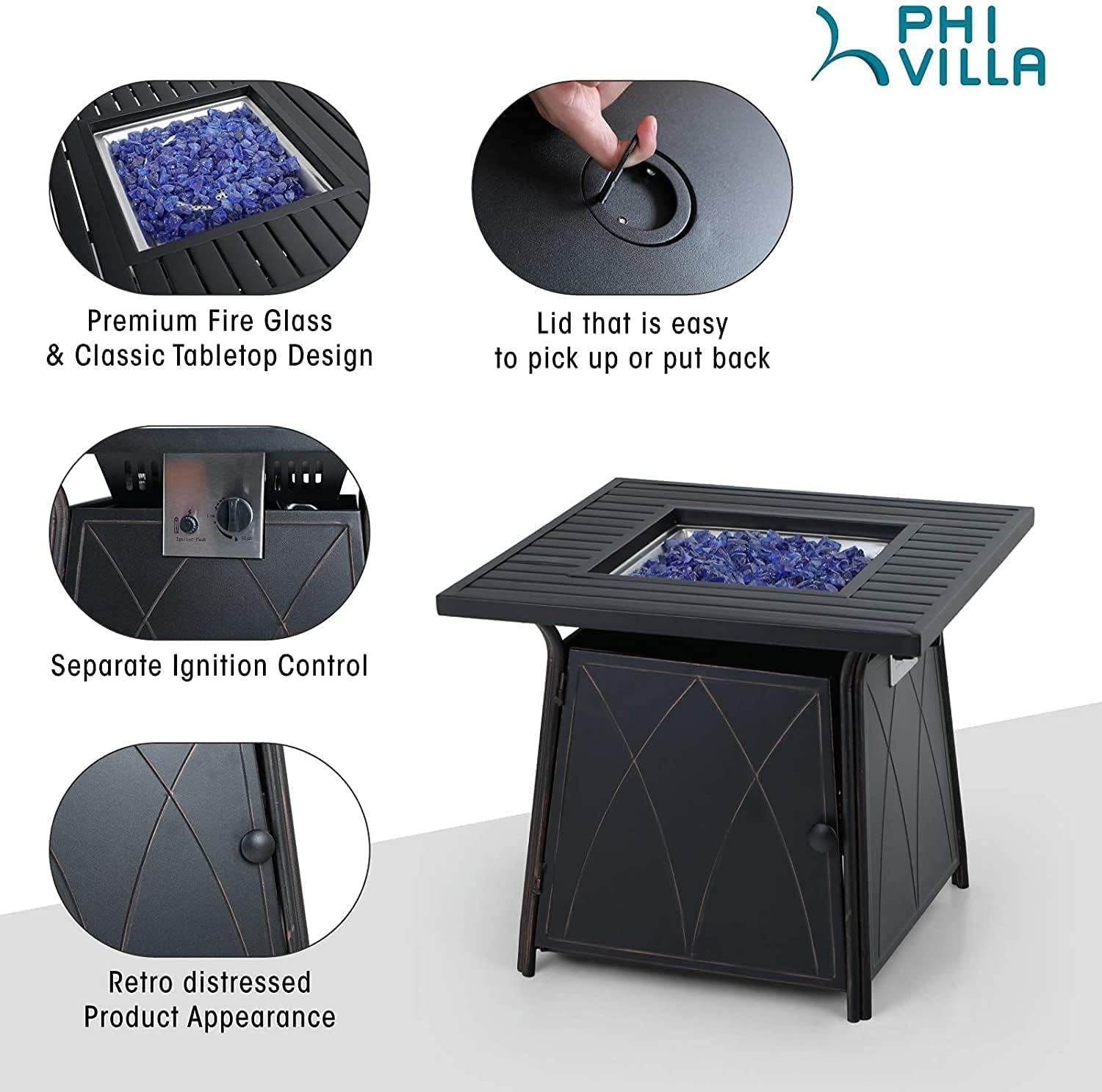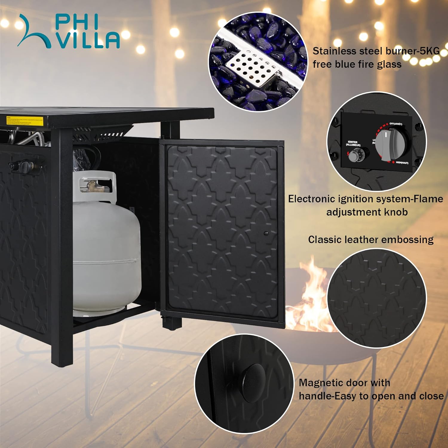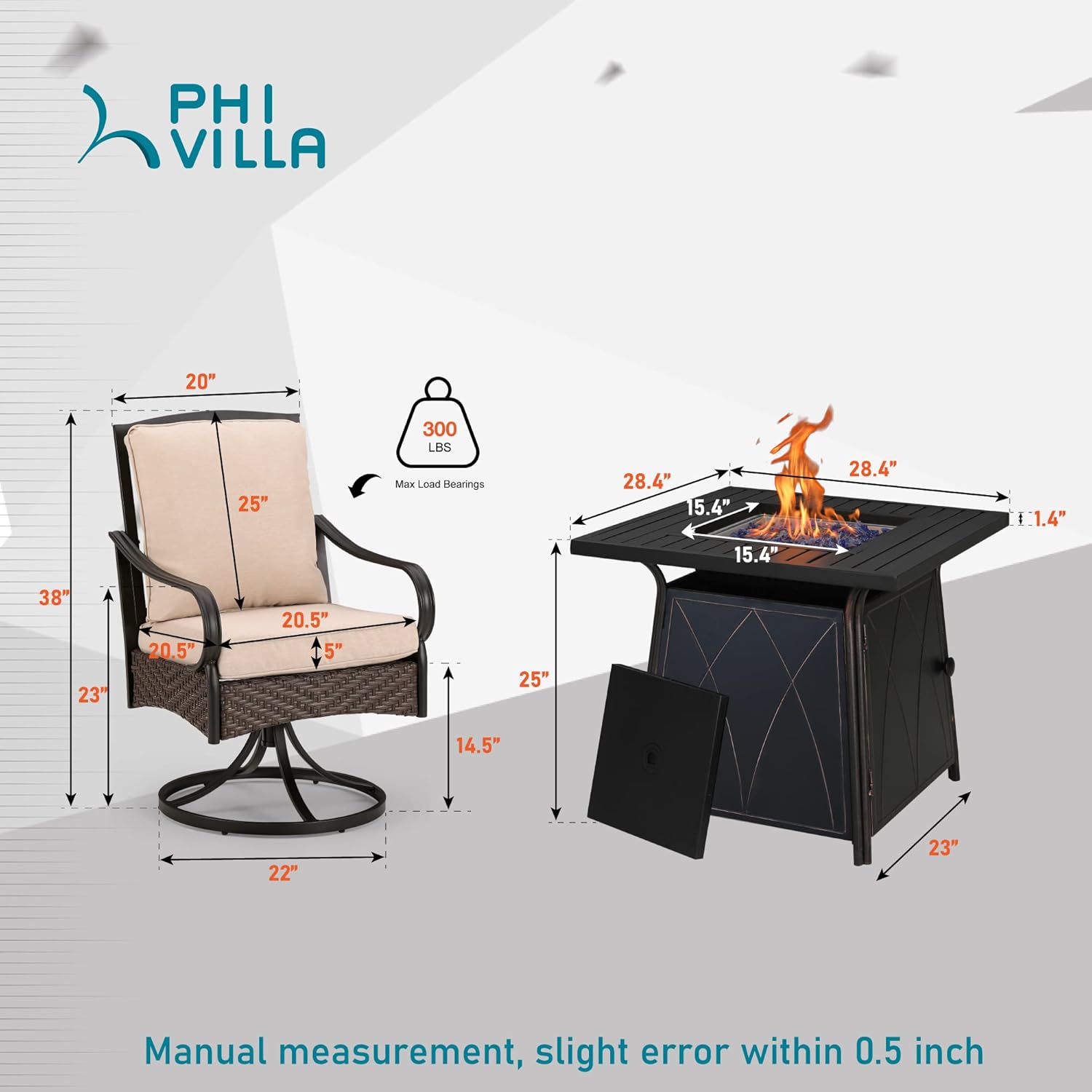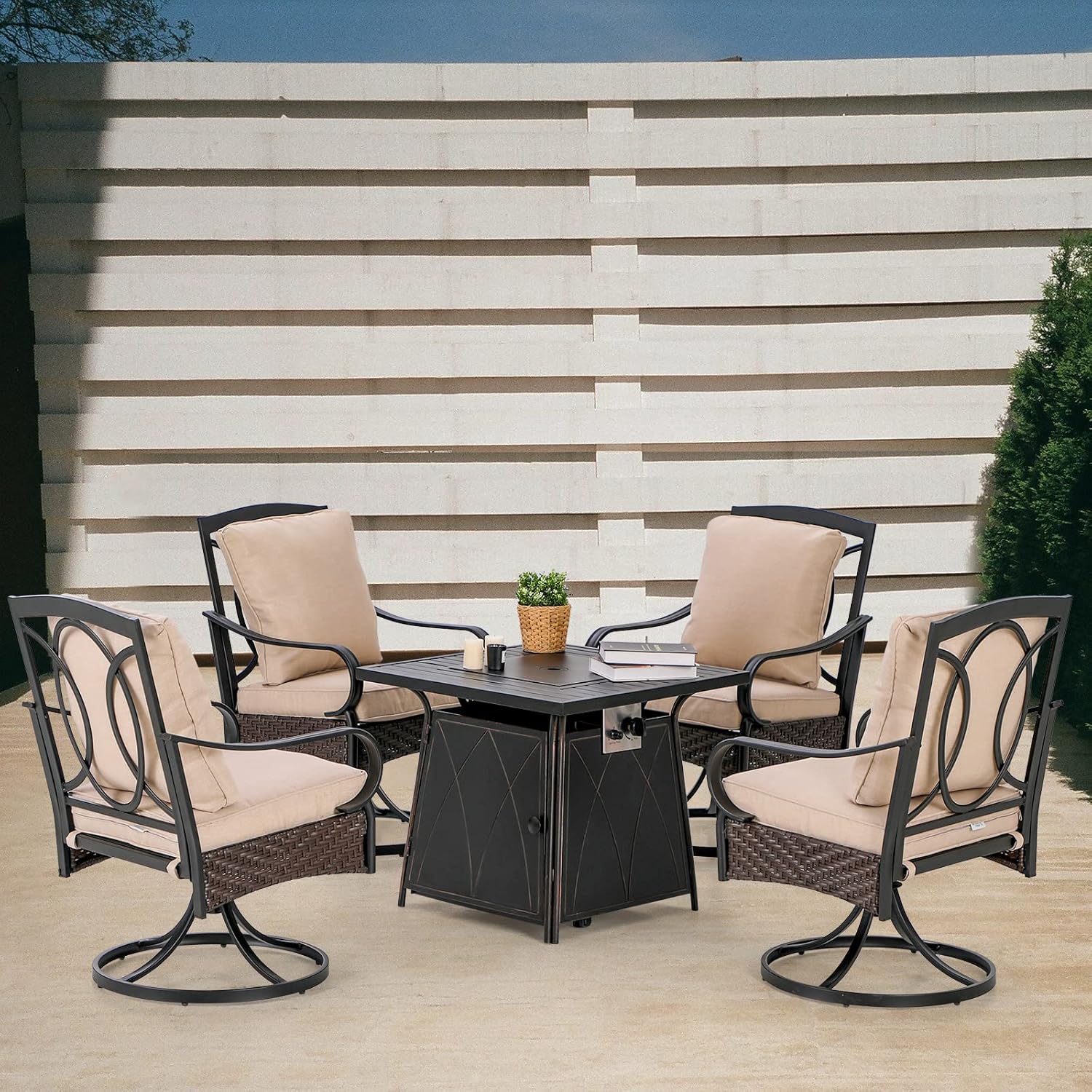 PHI VILLA Patio Set with Firepit Table for 4, 4 Patio Swivel Dining Chairs and One 28 inch 50000 BTU Auto-Ignition Propane Gas Fire Pit Table,Metal Patio Furniture for Outdoor Kitchen Lawn and Garden