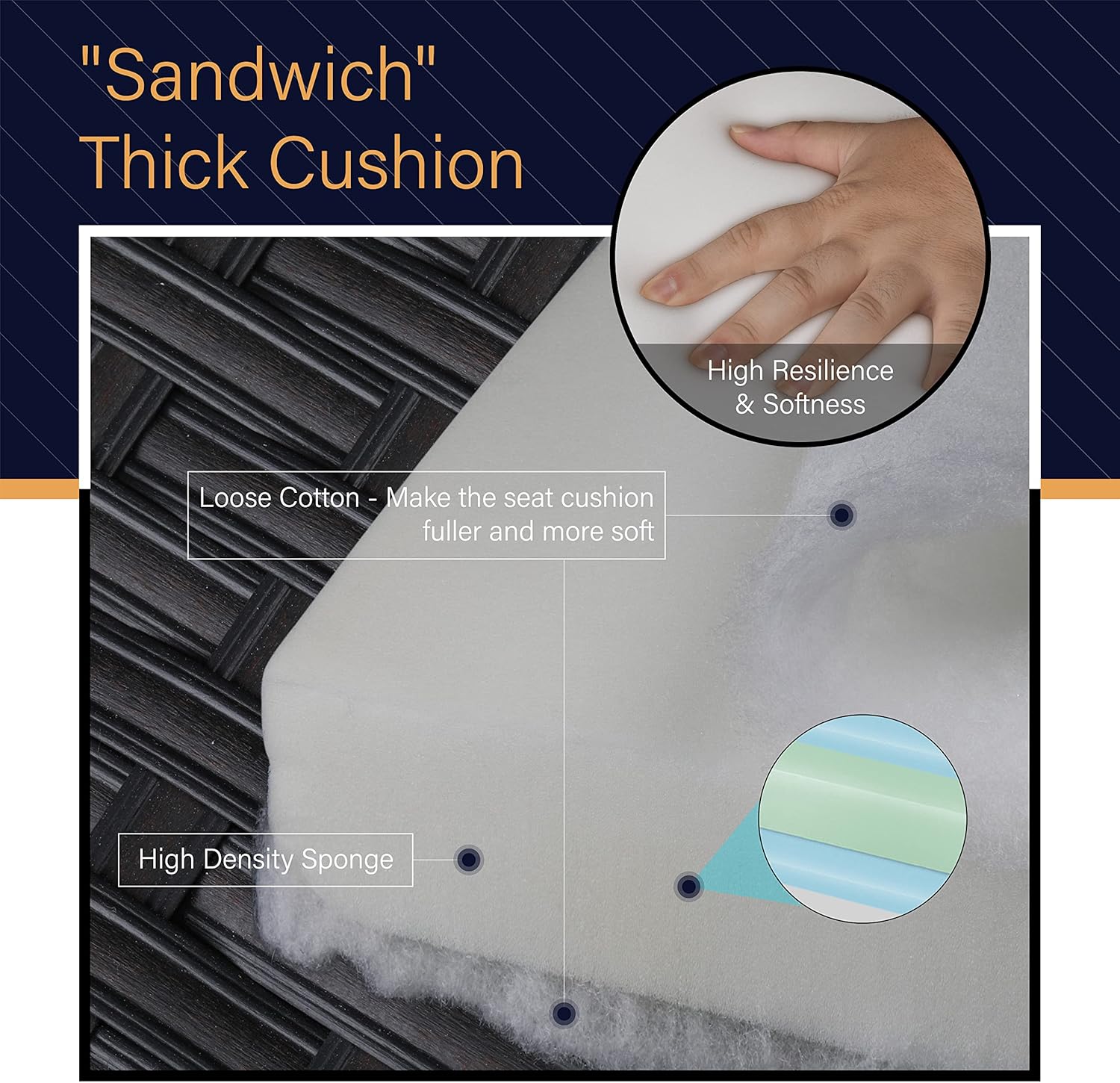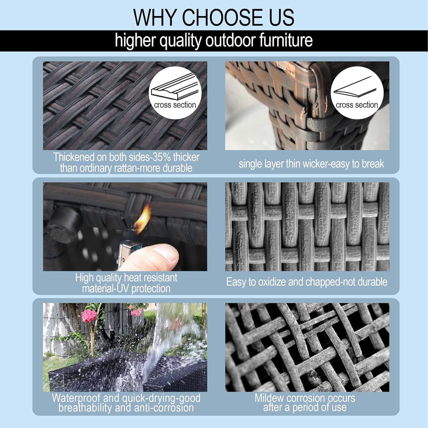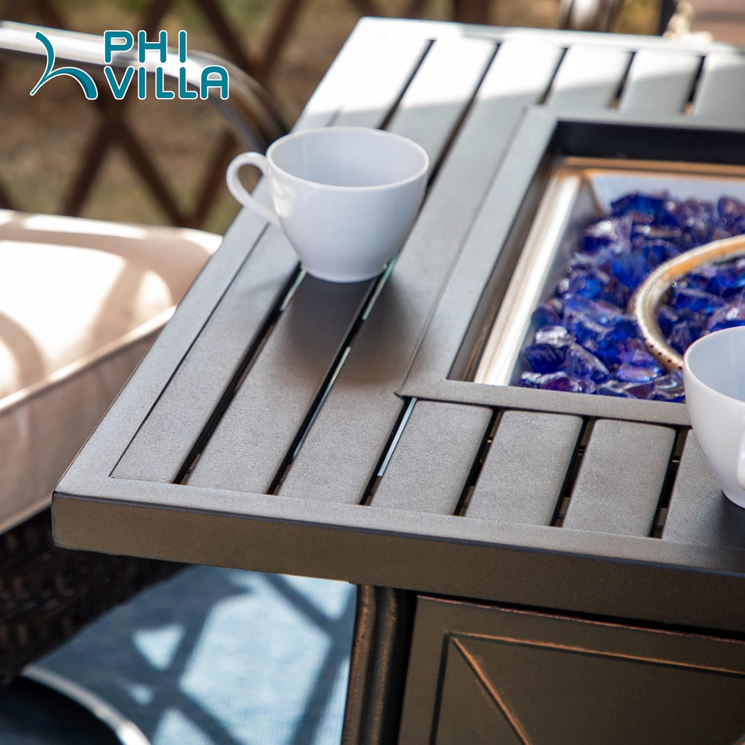 PHI VILLA Patio Furniture Sectional Sofa Set with CSA Approved Gas Fire Pit Table Wicker Rattan Outdoor Conversation Sets Propane Rectangular Fire Pit Table, 3 Pieces Blue