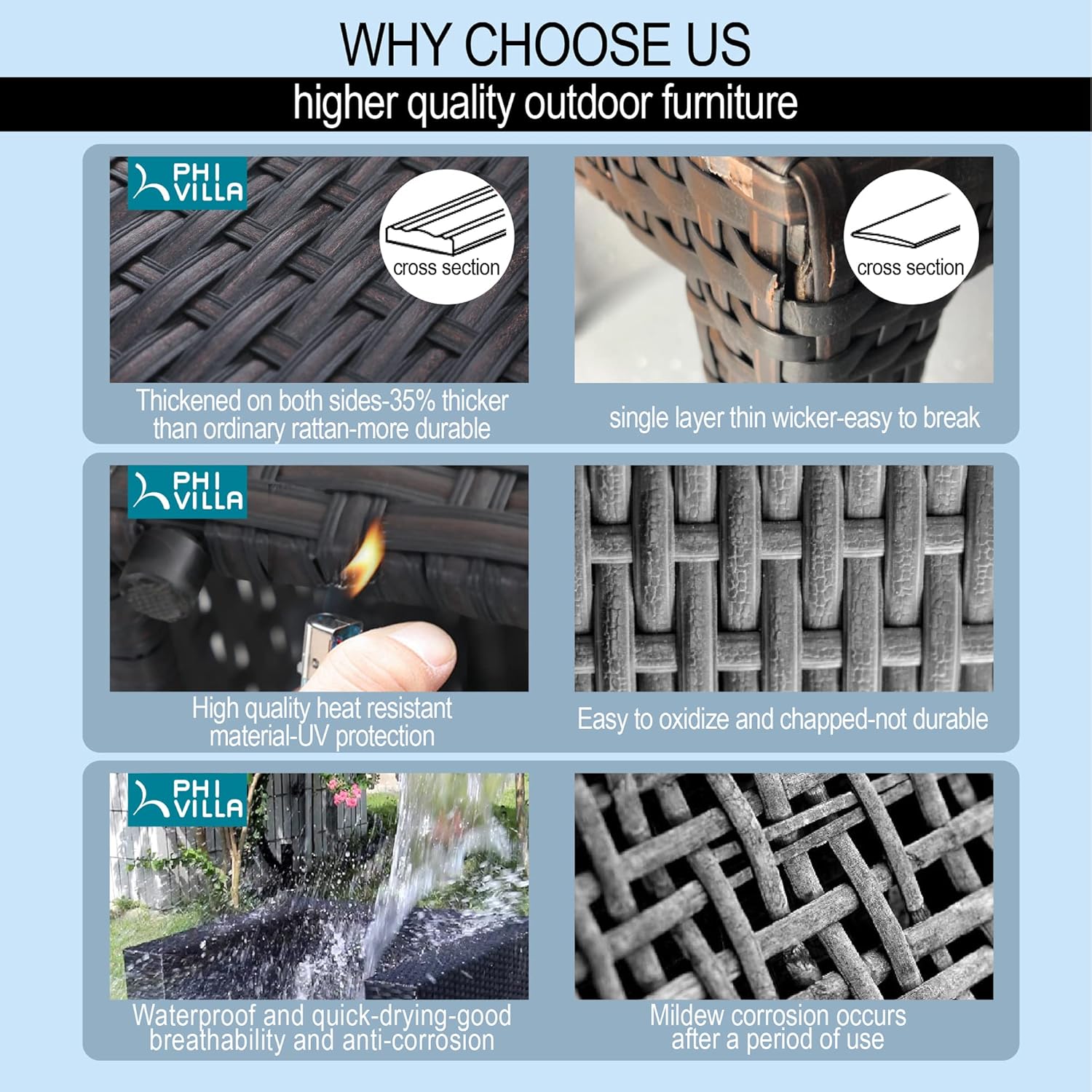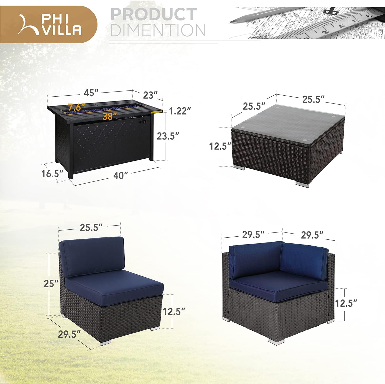 PHI VILLA 6-Piece Patio Furniture Set with Fire Pit Table Wicker Sectional Sofa Set Outdoor Rattan Patio Conversation Sets w/CSA Approved 45 Inch 50,000 BTU Propane Gas Fire Pit Table & Coffee Table