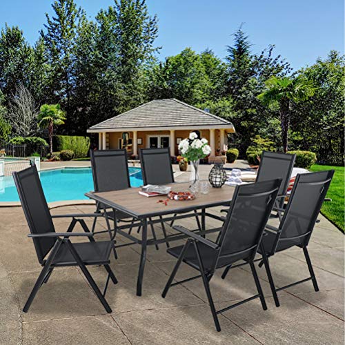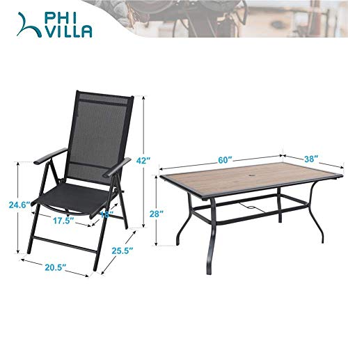 PHI VILLA Outdoor Patio Dining Sets for 6, Outdoor Furniture Dining Table Set with 6 Reclining Folding Sling Patio Chairs & 1 Large Rectangular Wood Like Top Table for Yard, Black