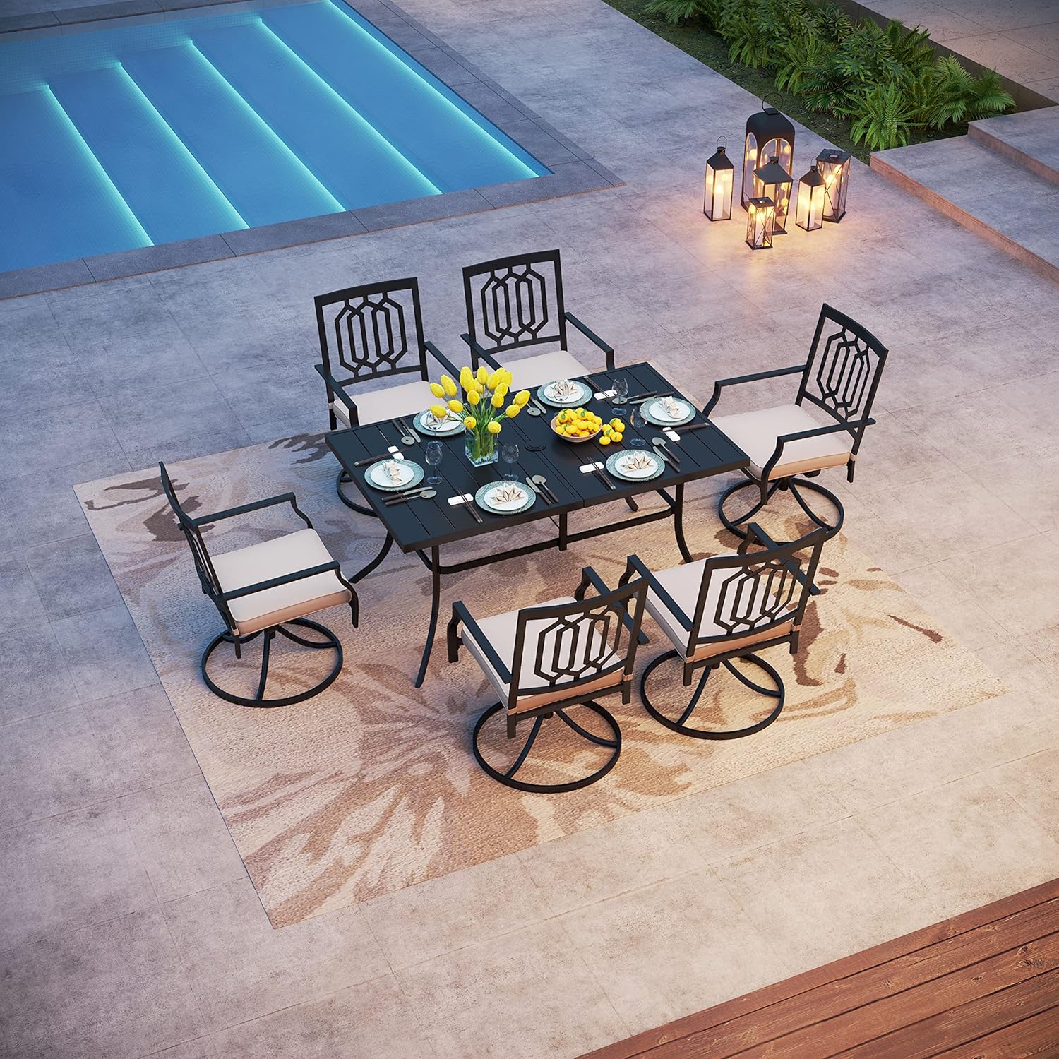 PHI VILLA Patio Dining Set 7 Pcs 1 Metal Umbrella Hole Table and 6 Swivel Chairs Support 300 lbs for Outdoor Backyard Bistro Furniture Set with Cushion
