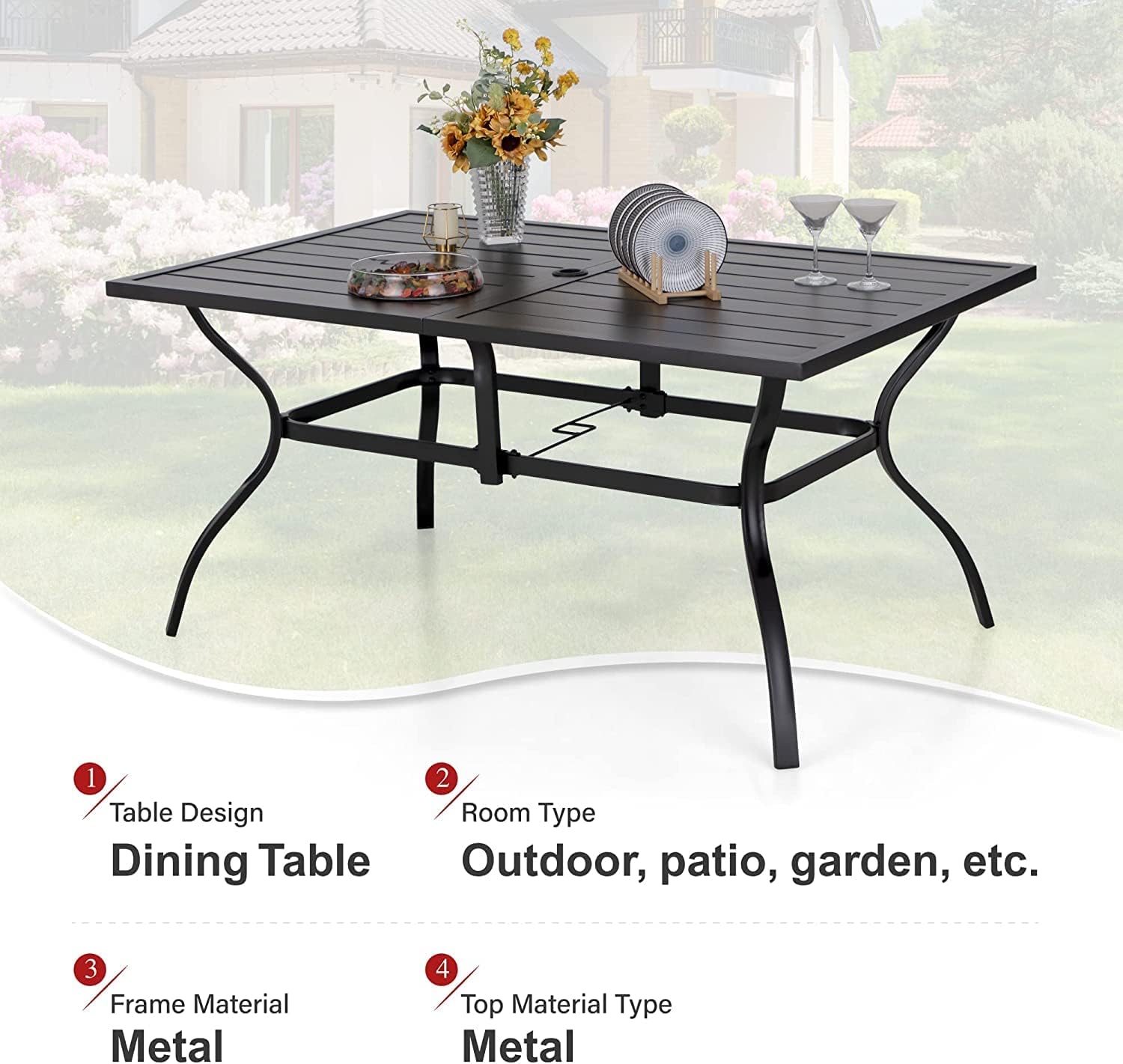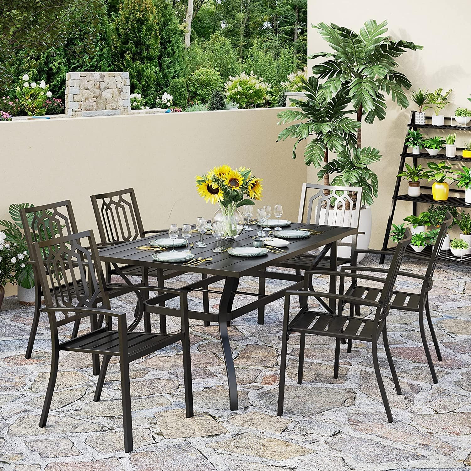 PHI VILLA 7-Piece Outdoor Patio Dining Set, 6 Stackable Metal Chairs with E-Coating and 1 Rectangular Table with Umbrella Hole for Patio, Deck