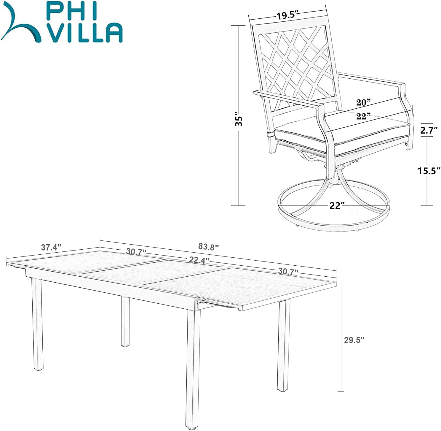 PHI VILLA Patio Dining Set 7 Pcs 1 Extendable Dining Table and 6 Swivel Chairs Support 300 lbs for Outdoor Backyard Bistro Furniture Set with Cushion