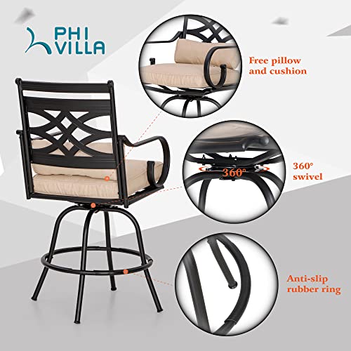 PHI VILLA Outdoor Swivel Bar Stools,Bar Height Patio Chairs with Back and Armrest,Set of 2,Metal,Black