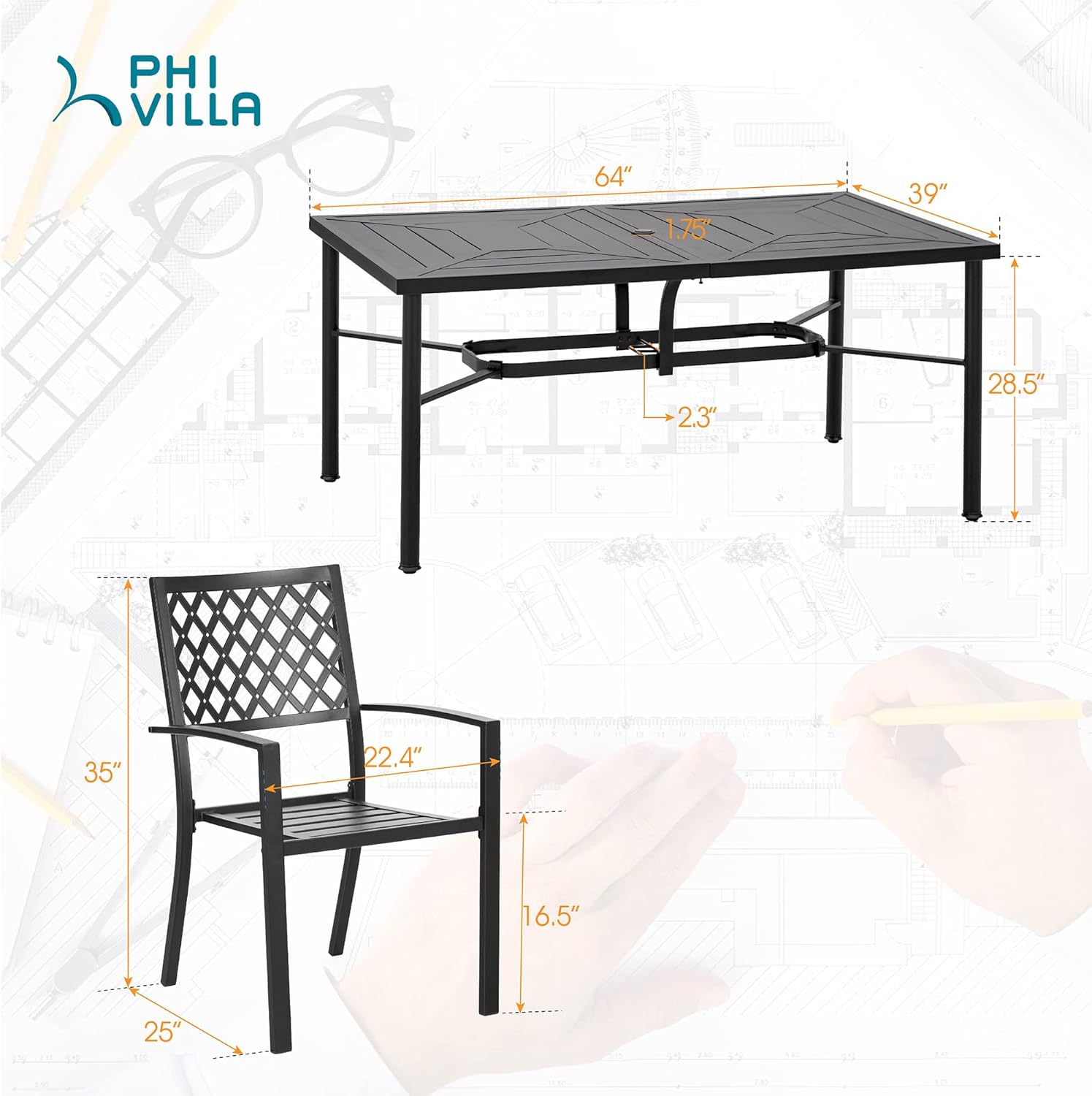 PHI VILLA 7-Piece Outdoor Dining Set, Rectangular Metal Table (64") with Umbrella Hole and 6 Stackable Dining Chairs – Perfect for Patio, Garden, Deck, Porch, and Yard, 7PCS Outdoor Dining Set Style 1