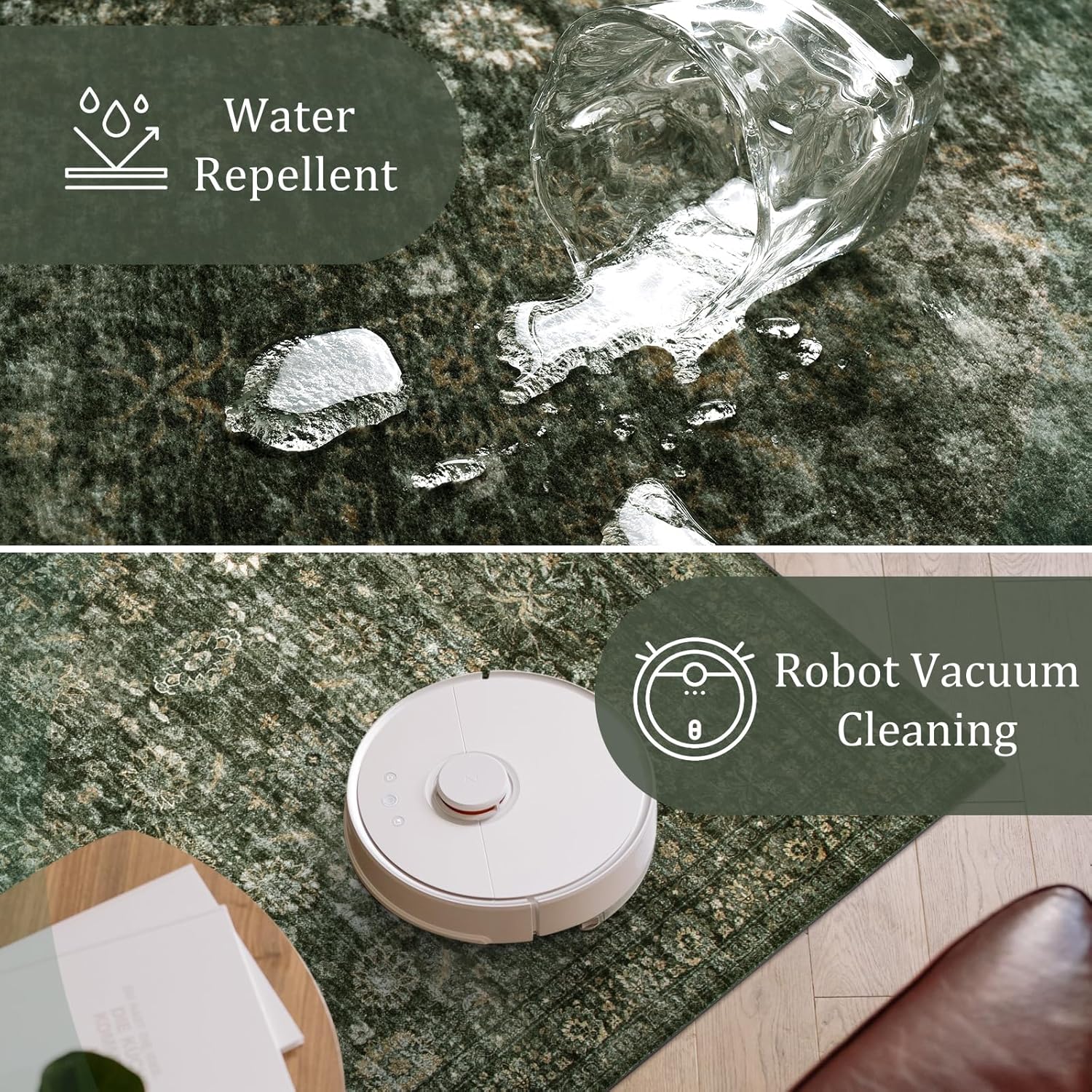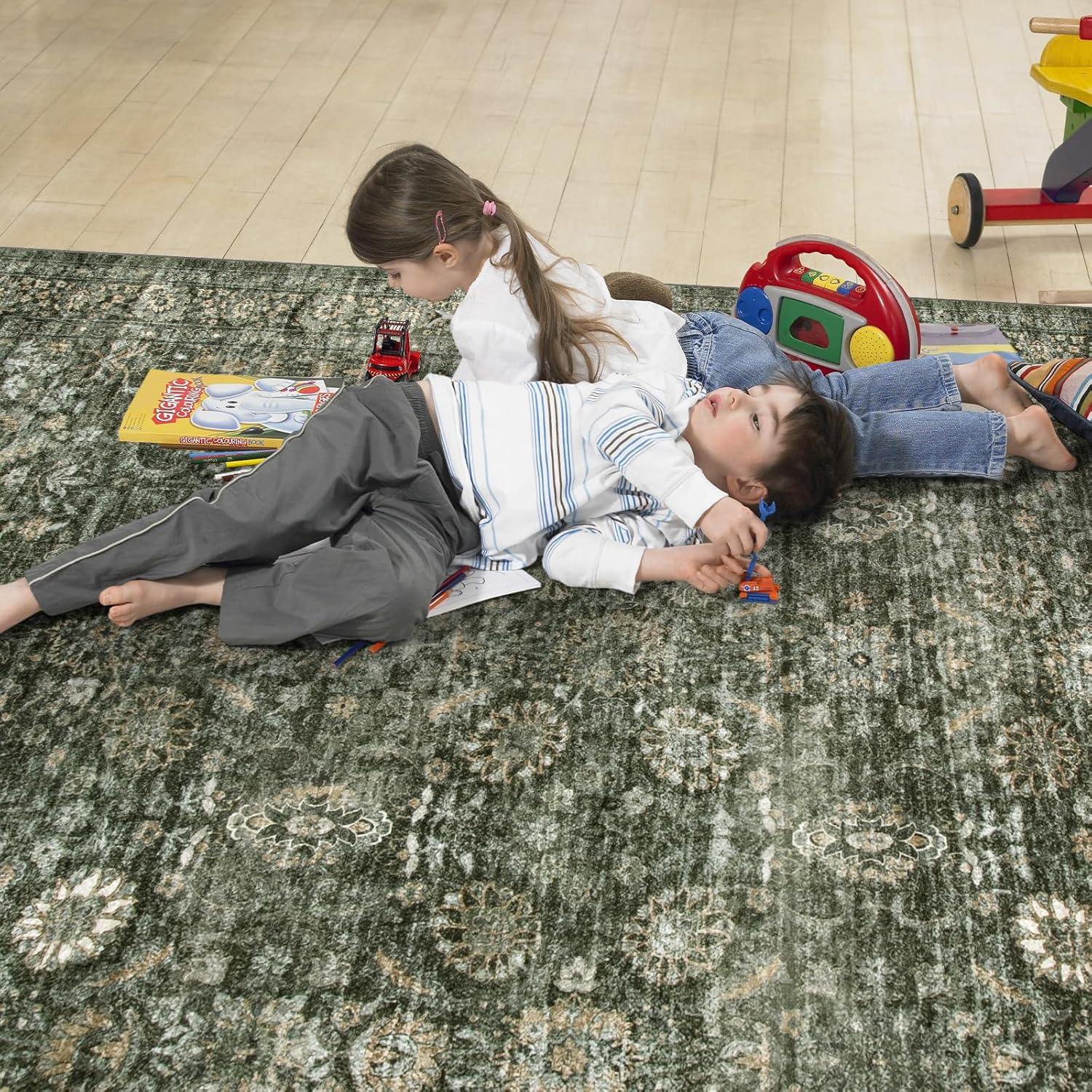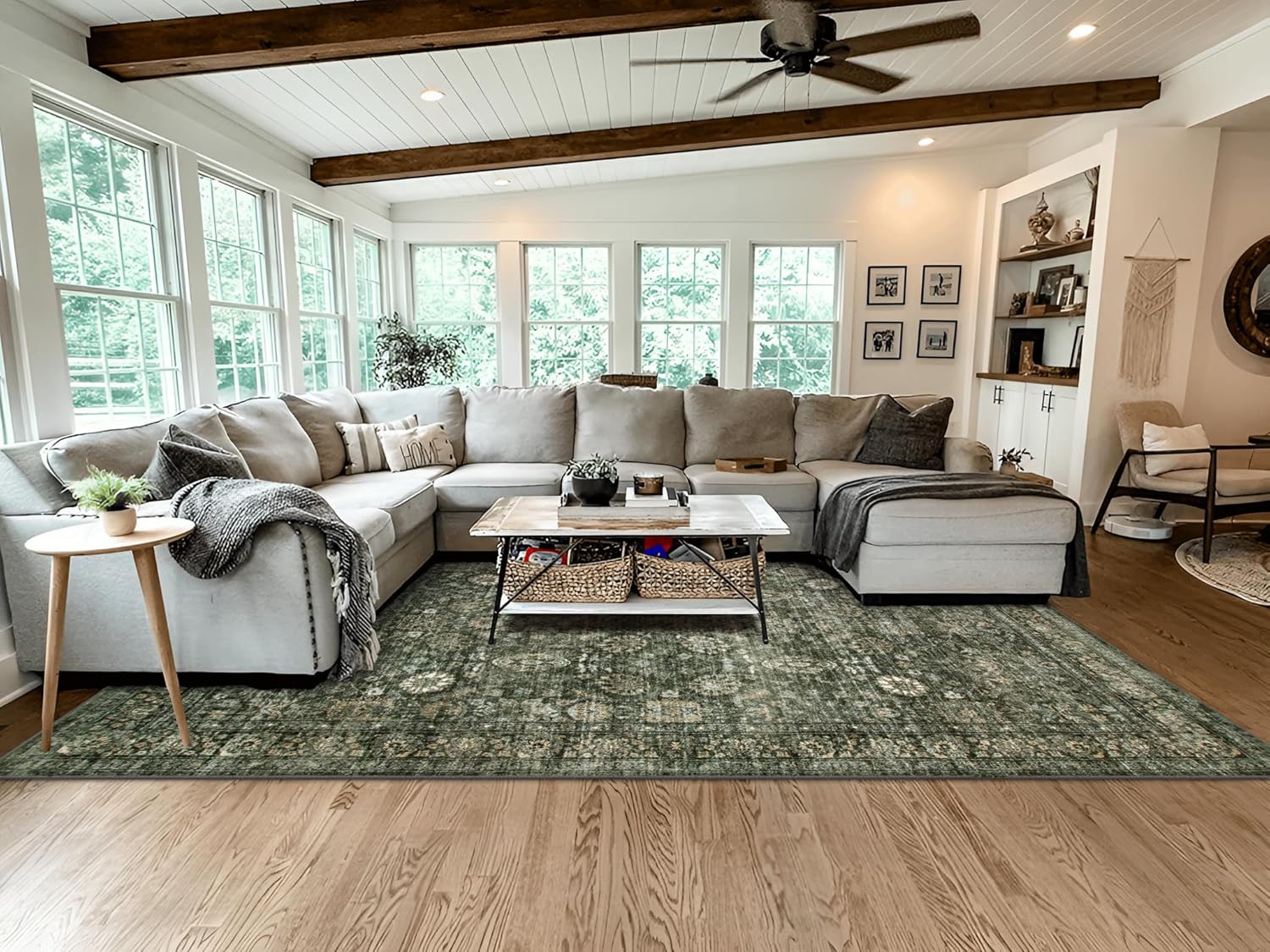 Vintage Green Living Room Rug, 9x12 Area Rug Washable Boho Rugs for Bedroom, Soft Dining Room Carpet Non-Slip Non-Shedding Throw Rug for Farmhouse Indoor Kids Playroom