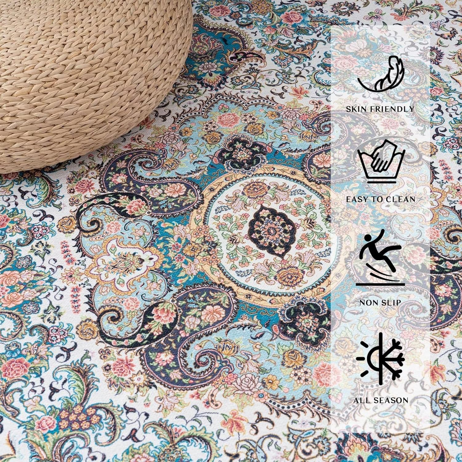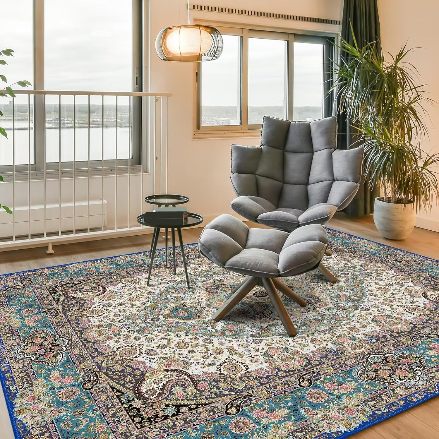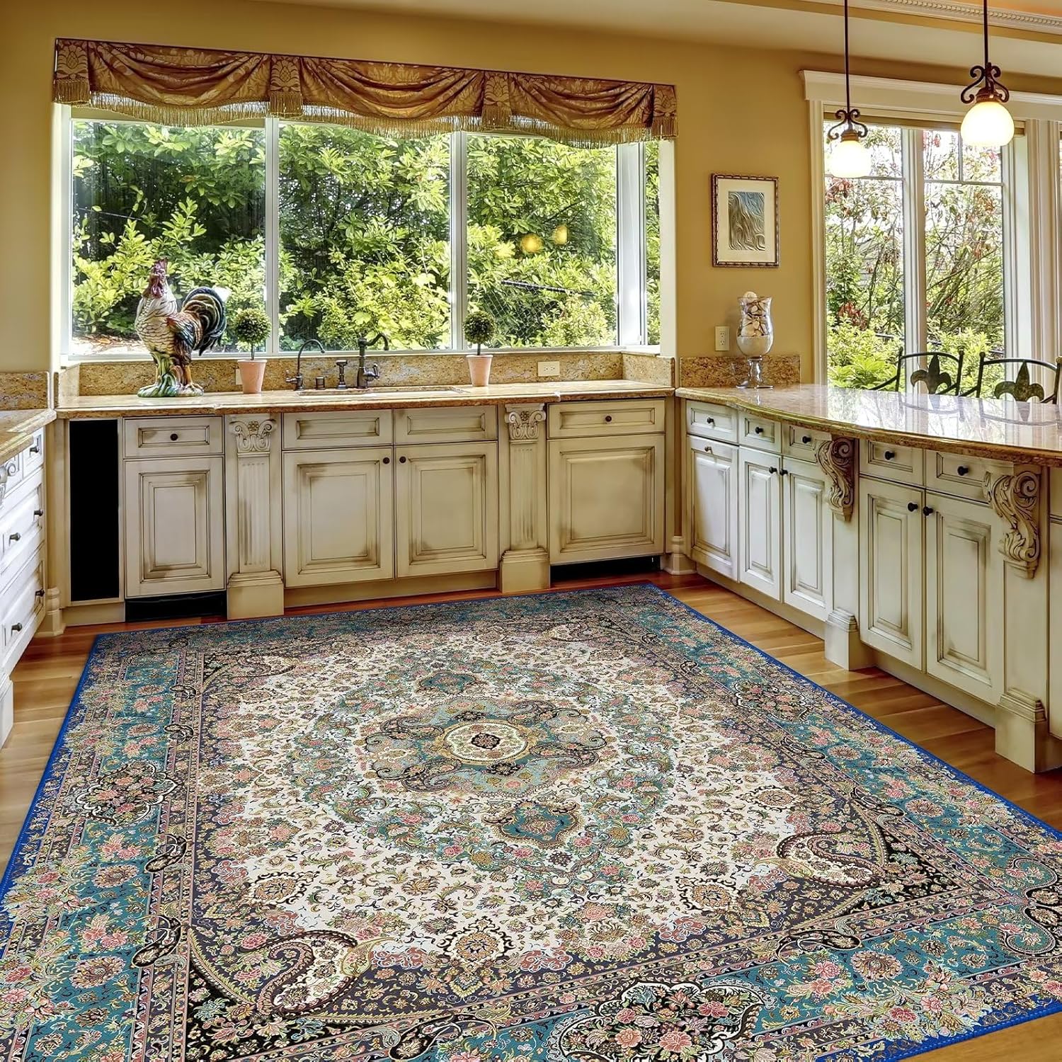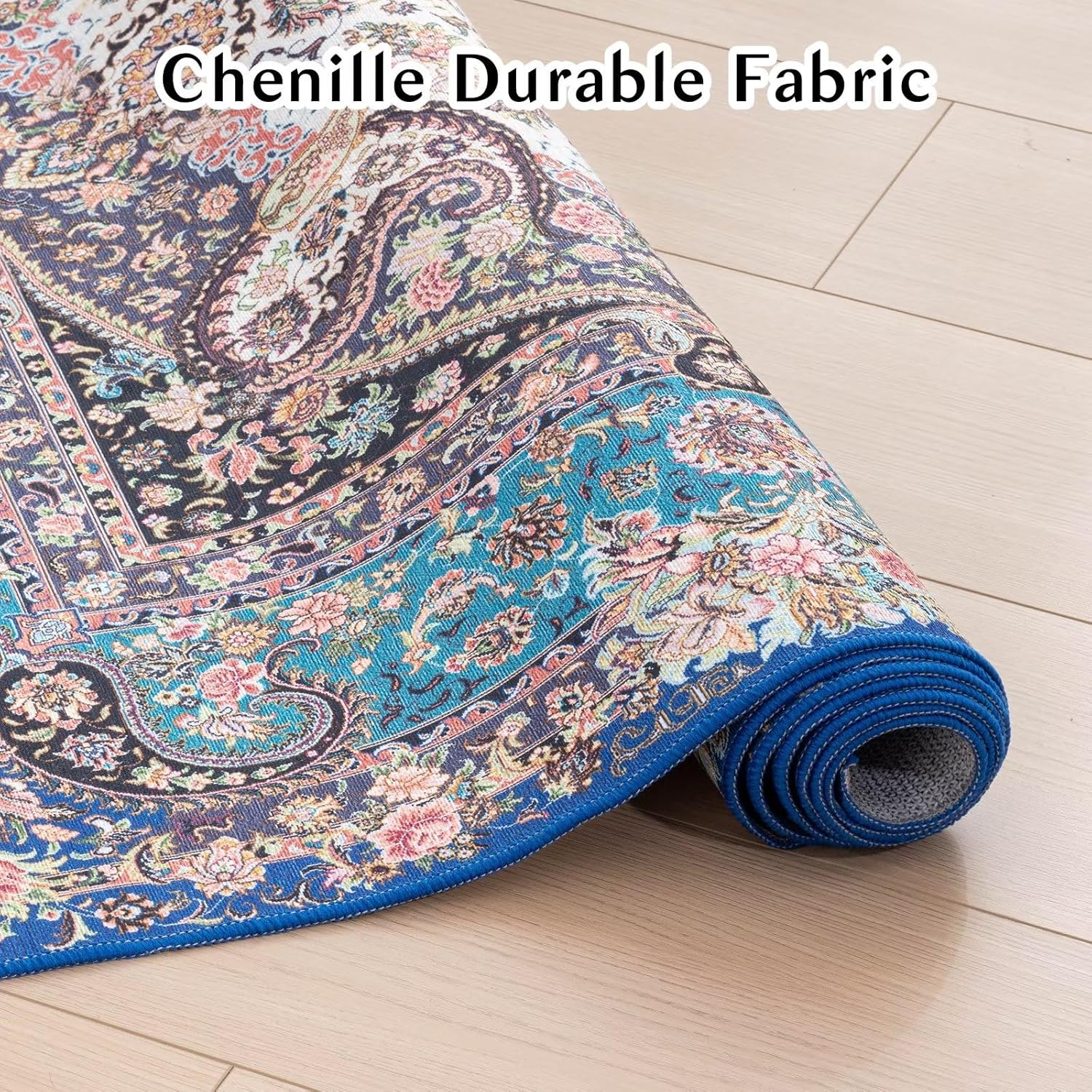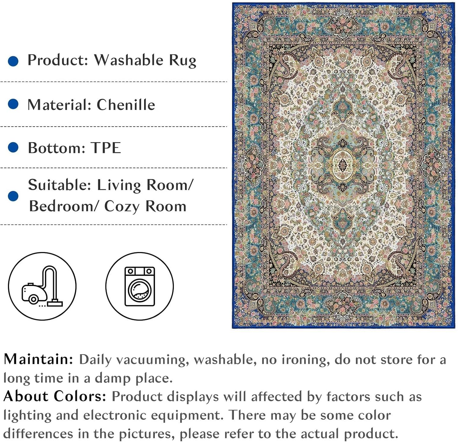 Vamcheer Vintage Washable Area Rug 9x12 - Classic Chenille Rugs for Living Room Bedroom Dining Room Traditional Carpet for Office Kitchen Non Slip Peacock Blue/Floral Outdoor Rug