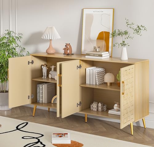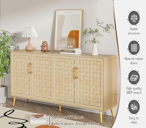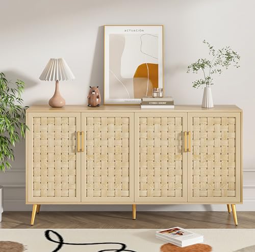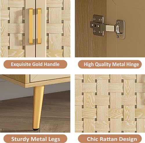 4 Door Rattan Storage Cabinet,Buffet Cabinet with Storage,Characteristic Cabinet w/Metal Legs and Handles,Cupboard Console Table,Sideboard Cabinet for Hallway,Entry, Living Room (Natural)