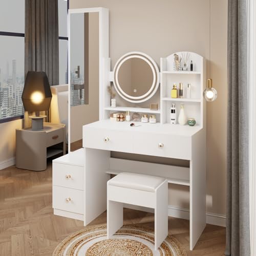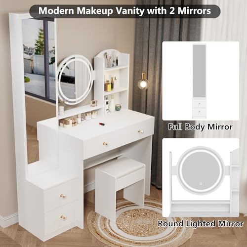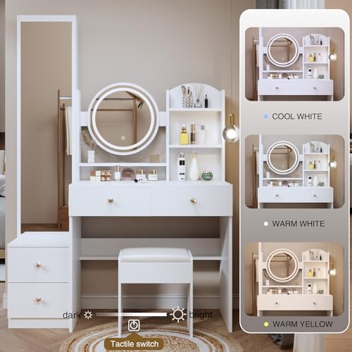 Betoko Makeup Vanity Desk with Full Length Mirror and Lights, Modern Dressing Table Set with Upholstered Stool Corner Dresser Desk with Storage Drawers and Shelves for Women for Bedroom(White)