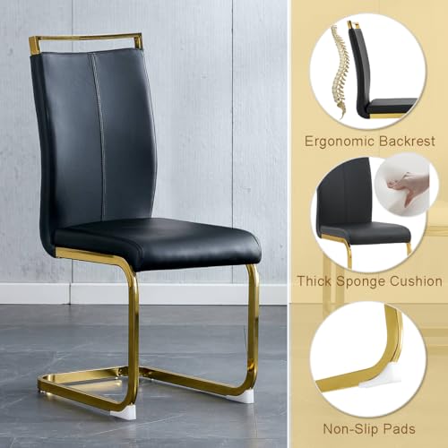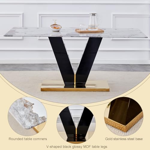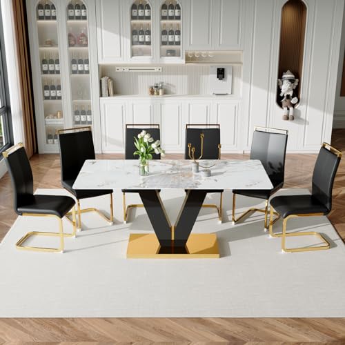 Dining Table Set for 6,Modern Marble Dining Table Set,71'' Rectangular Glass Dinner Table and 6 Black PU Chairs,Gold Dining Table and Chairs Set, Ideal for Dining Room Kitchen