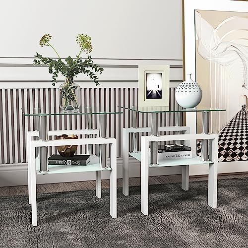 Glass Side Table 2-Tier Modern Glass Top Corner Table Living Room Side Table with Metal Leg for Living Room, Dining Room, Bedroom (White-H, 1pc)